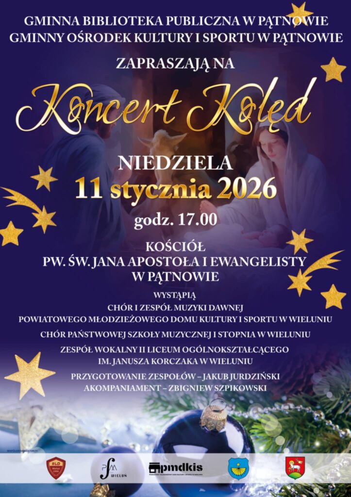 Zapraszamy na Koncert Kolęd w niedzielę 11 stycznia 2026 r. o godz. 17.00 do Kościoła pw. św. Jana Apostoła i Ewangelisty w Pątnowie. Wśród wykonawców: chór Państwowej Szkoły Muzycznej I stopnia w Wieluniu, chór i zespół muzyki dawnej Powiatowego Młodzieżowego Domu Kultury i Sportu w Wieluniu oraz zespół wokalny II Liceum Ogólnokształcącego im. J.Korczaka w Wieluniu. Przygotowanie zespołów - Jakub Jurdziński, akompaniować będzie Zbigniew Szpikowski.