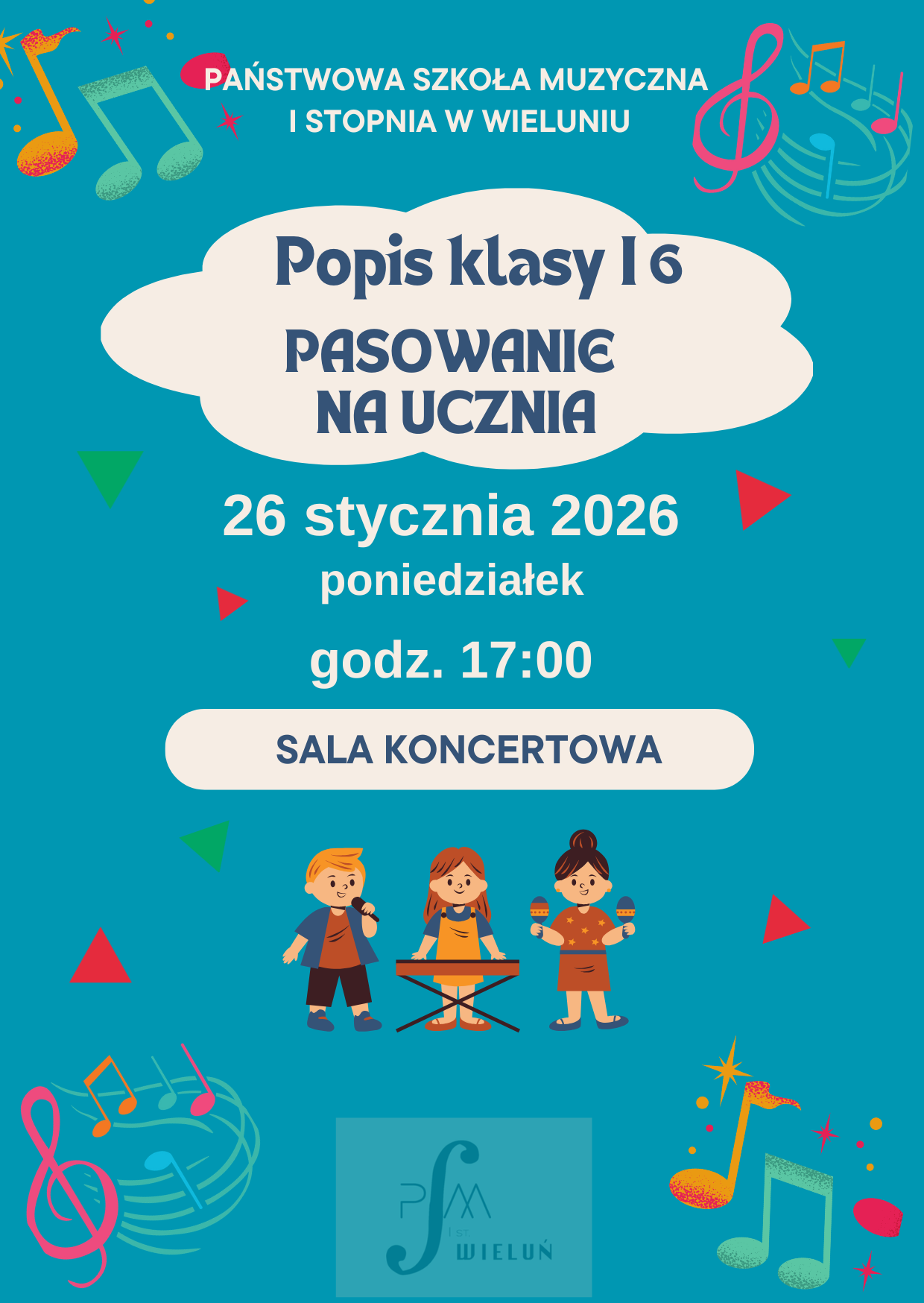 Zapraszamy na popis klasy I c.6 połączony z pasowaniem na ucznia Państwowej Szkoły Muzycznej I stopnia w Wieluniu, który odbędzie się w poniedziałek 26 stycznia 2026 r. o godz. 17.00 w auli szkoły.