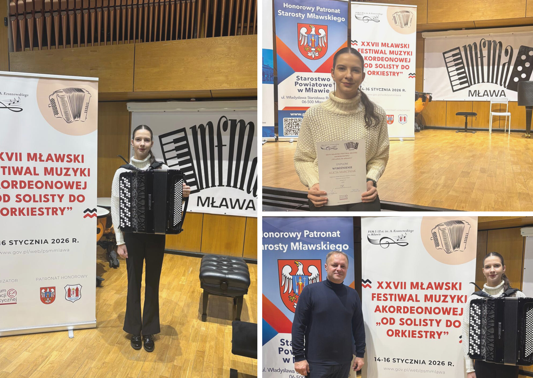 W XXVII Mławskim Festiwalu Muzyki Akordeonowej ,, Od solisty do orkiestry” , organizowanym przez Centrum Edukacji Artystycznej, Alicja Marciniak z klasy p.Dariusza Wlazło, odniosła znaczący sukces. Spośród 37 wykonawców z całej Polski Alicja zdobyła wyróżnienie, zachwycając muzykalnością , wrażliwością oraz ekspresją muzyczną.