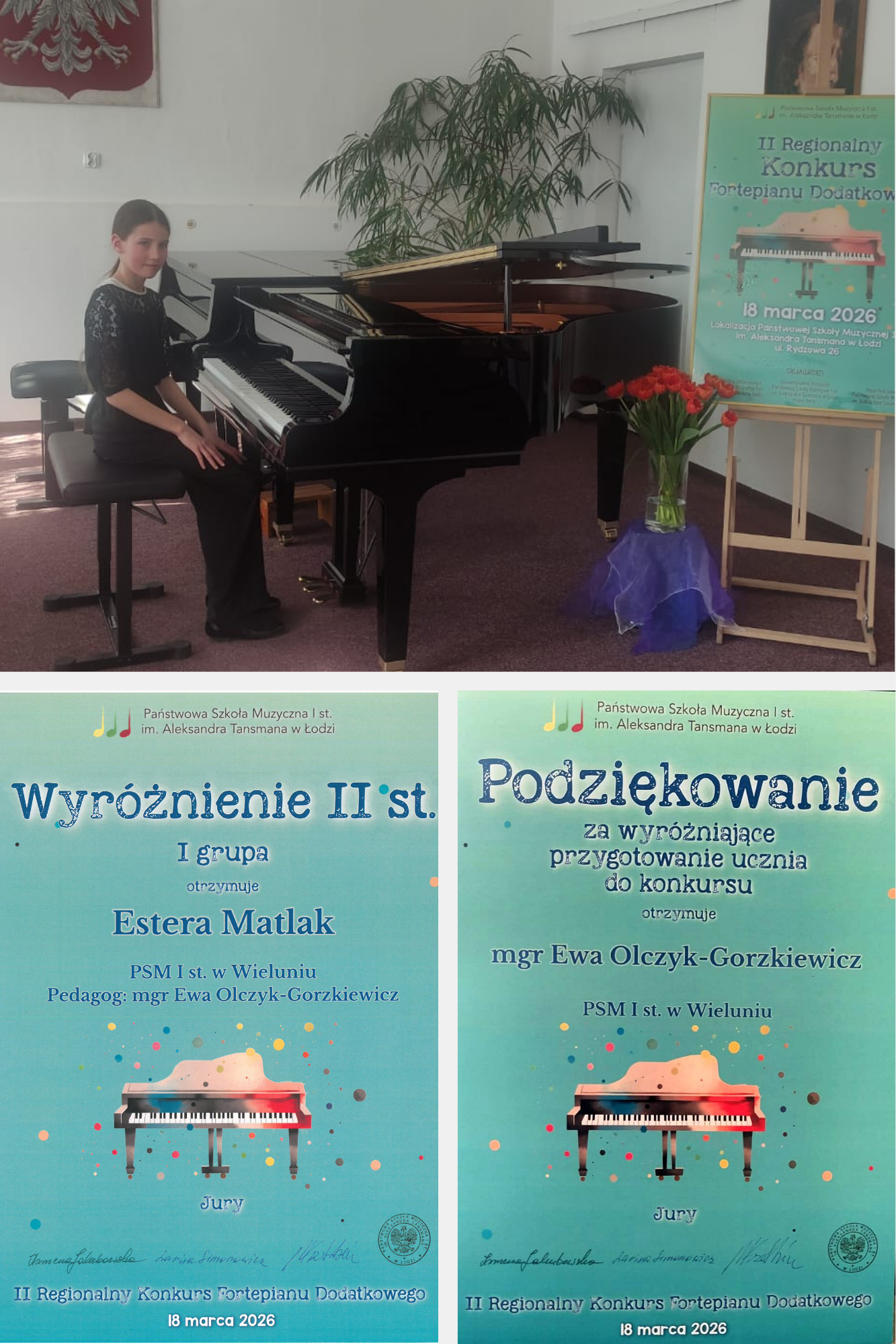 Z radością informujemy, że podczas II Regionalnego Konkursu Fortepianu Dodatkowego nasza uczennica klasy V cyklu sześcioletniego, Estera Matlak, zdobyła Wyróżnienie II stopnia