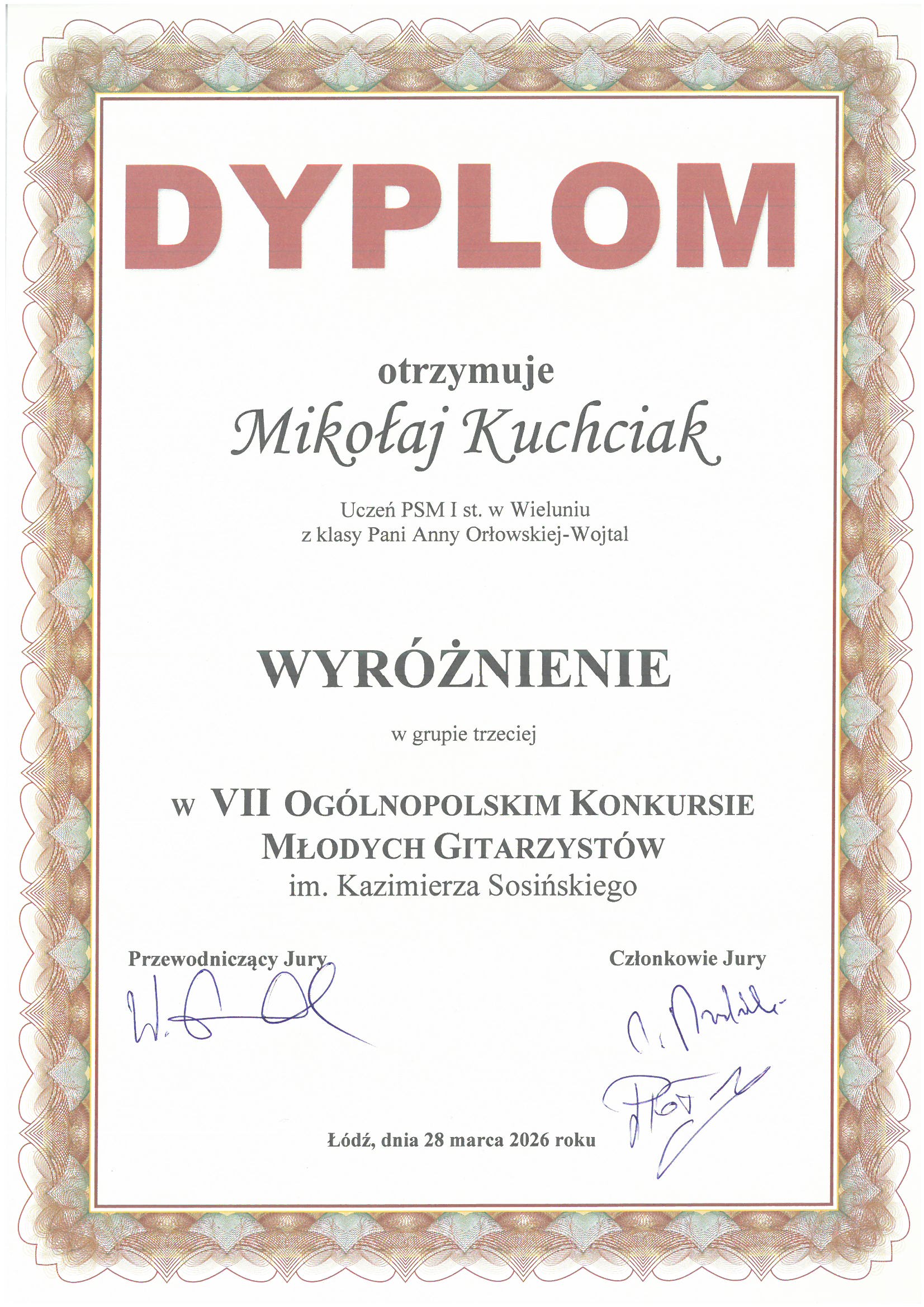 Z ogromną radością informujemy, że Mikołaj Kuchciak zdobył wyróżnienie w VII Ogólnopolskim Konkursie Młodych Gitarzystów im. Kazimierza Sosińskiego. Sukces tym większy, bo konkurencja i ilość uczestników w grupie Mikołaja była znaczna.
