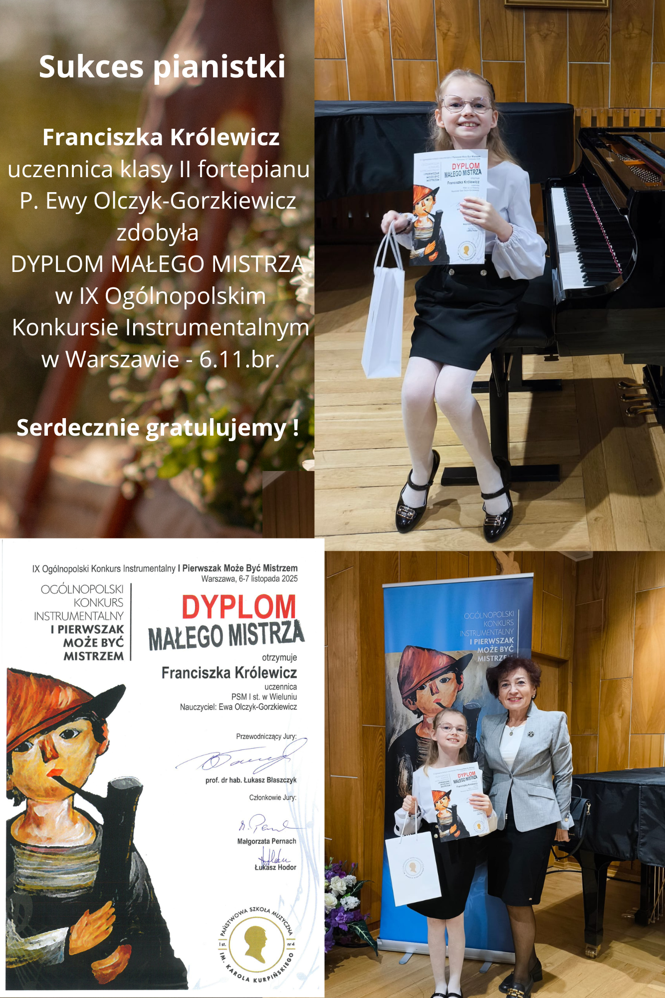 Obraz przedstawia kolaż 4 zdjęć. Na jednym dyplom uczennicy Franciszki Królewicz za zdobycie tytułu Małego Mistrza w Konkursie I Pierwszak może być mistrzem. Kolejne dwa zdjęcia to fotografia przedstawiająca uczennicę Franciszkę Królewicz siedzącą przy fortepianie i trzymającą dyplom w ręce, w prawym dolnym rogu zdjęcie przedstawiające Ewą Olczyk-Gorzkiewicz z Franciszką Królewicz na tle plakatu informacyjnego konkursu, w lewym górnym rogu obraz zawierający tekst informujący o sukcesie w rzeczonym konkursie.