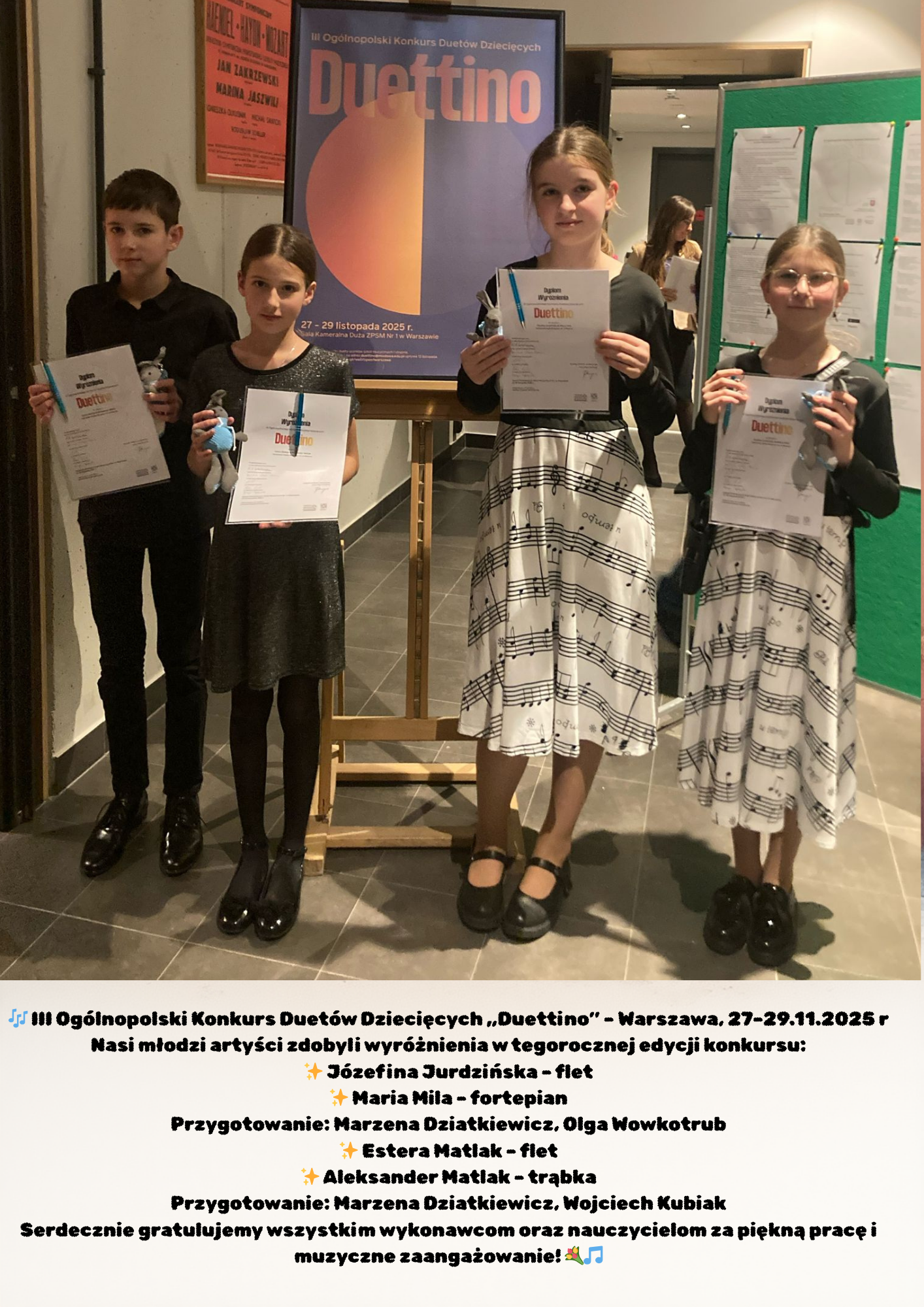 Zdjęcie przedstawia 4 uczniów (1 chłopiec i 3 dziewczynki) szkoły trzymających dyplomy wyróżnienia na Konkurskie Duettino. Ubrani odświętnie, 2 dziewczynki mają spódnice z materiału we wzór zapisów nutowych. W tle widać afisz konkursowy, Na dole zdjęcia zawarta jest informacja o zdobytych wyróżnieniach duetów: Józefina Jurdzińska - flet i Maria Mila - fortepian oraz Estera Matlak - flet i Aleksander Matlak - trąbka.