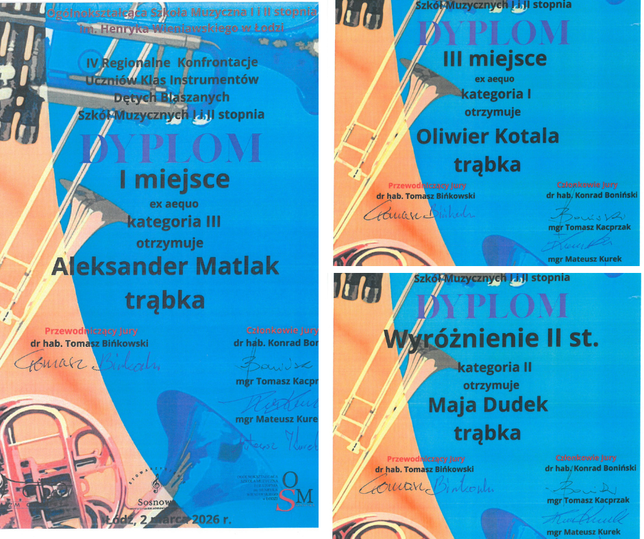 2 marca w Ogólnokształcącej Szkole Muzycznej I i II stopnia w Łodzi odbyły się IV Regionalne Konfrontacje Uczniów Klas Instrumentów Dętych Blaszanych Szkół Muzycznych I i II stopnia. Naszą szkołę, klasę trąbki p. Wojciecha Kubiaka, reprezentowała 1 uczennica i 2 uczniów. Wszyscy zaprezentowali się wspaniale i otrzymali dyplomy.