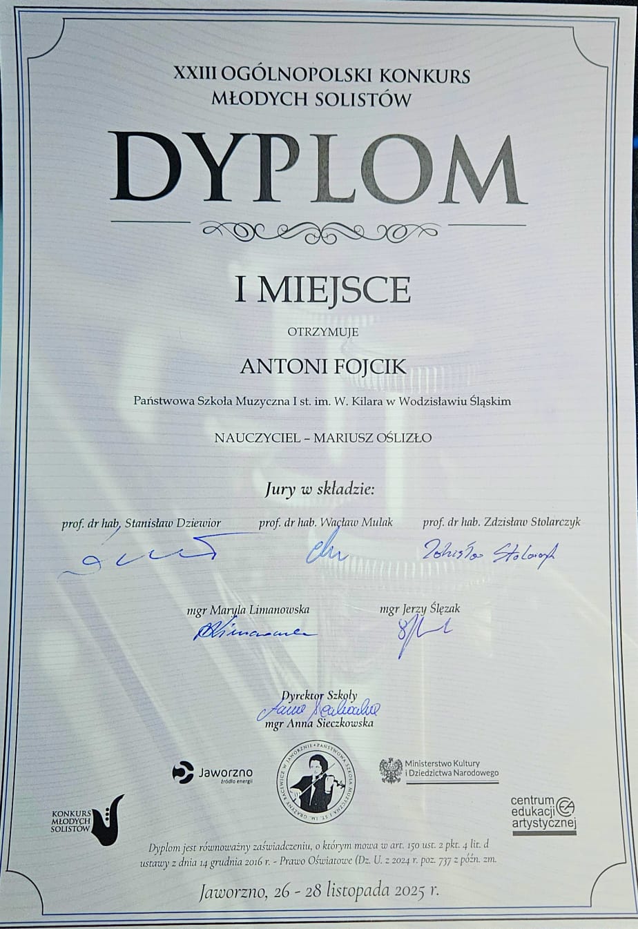 W dniach 26-28 listopada 2025 r. w PSM I stopnia im. Grażyny Bacewicz w Jaworznie odbył się XXIII Ogólnopolski Konkurs Młodych Solistów. Uczeń Antoni Fojcik z klasy trąbki Pana Mariusza Oślizło zajął I miejsce w swojej kategorii wiekowej.