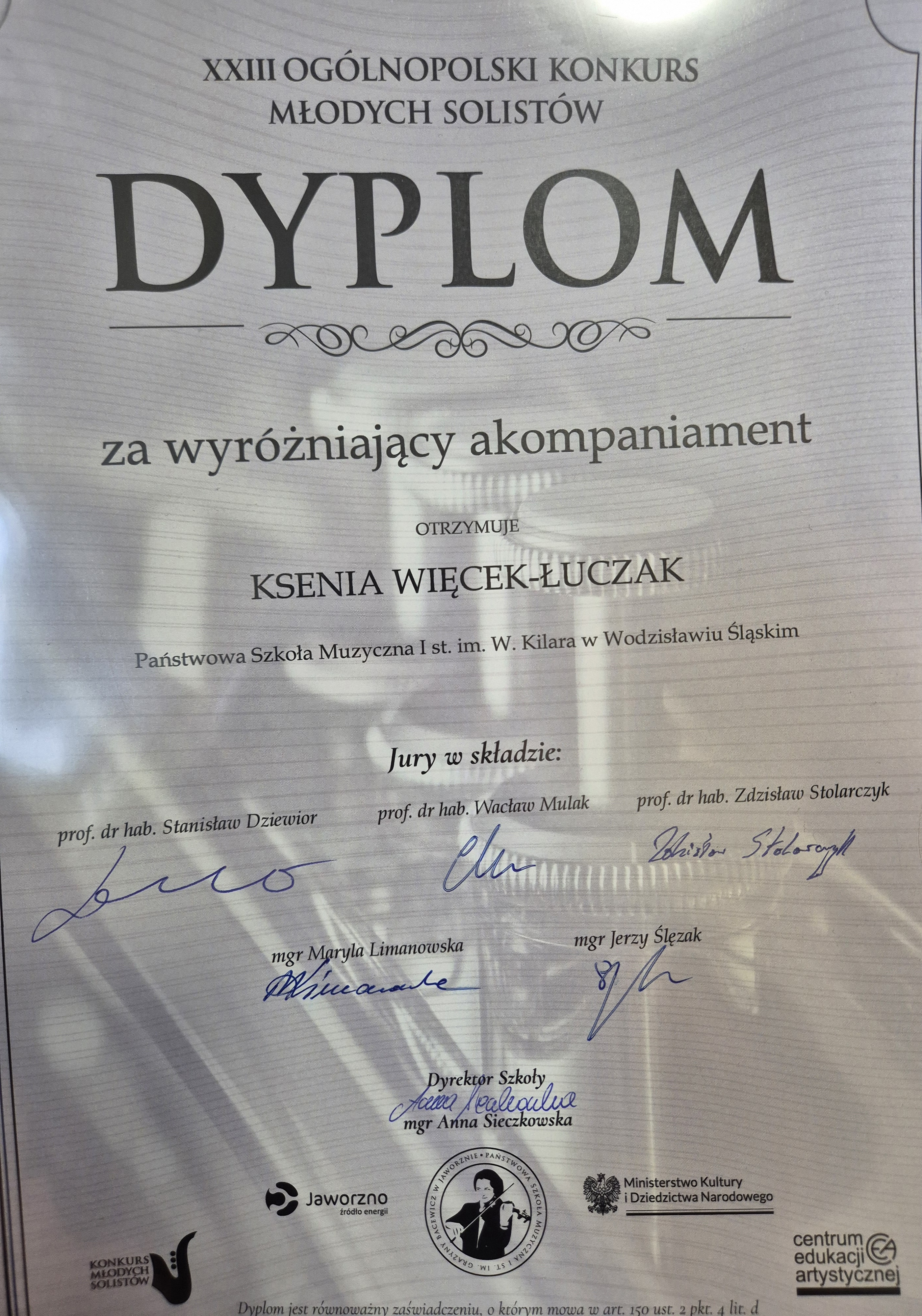 Uczniowi akompaniowała na konkursie Pani Ksenia Więcek-Łuczak, która otrzymała dyplom za wyróżniający akompaniament.
