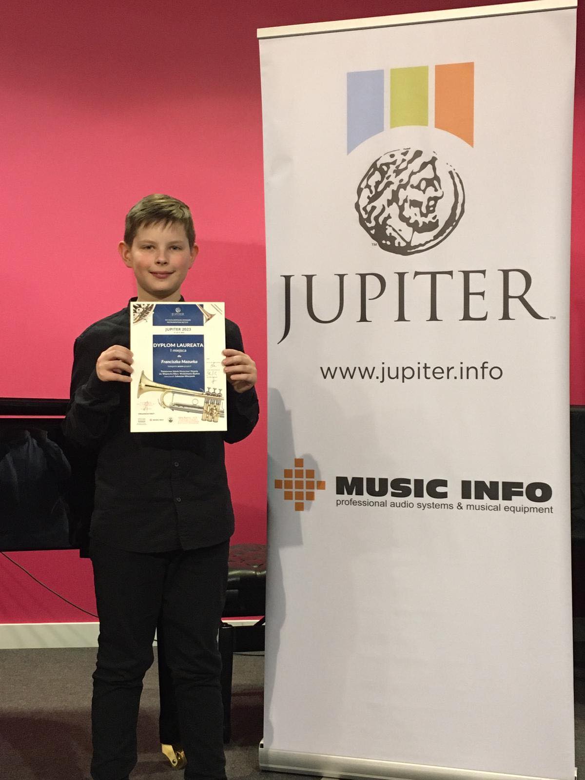 22 kwietnia Franciszek Mazurek z klasy puzonu p. Sebastiana Wieczorka zdobył I miejsce na XVI Ogólnopolskim Konkursie Instrumentów Dętych Jupiter 2023 w Krakowie. Frankowi akompaniowała p. Ksenia Więcek-Łuczak, która otrzymała wyróżnienie za akompaniament. Sebastian Wieczorek otrzymał wyróżnienie za przygotowanie ucznia do konkursu. Gratulujemy!