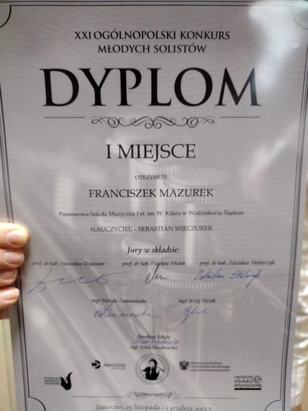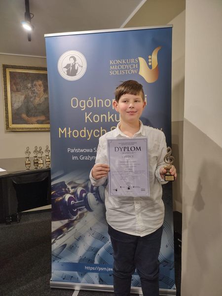 Ogromne gratulacje!!!Franciszek Mazurek z klasy Pana Sebastiana Wieczorka wygrał XXI Ogólnopolski Konkurs Młodych Solistów w Jaworznie.