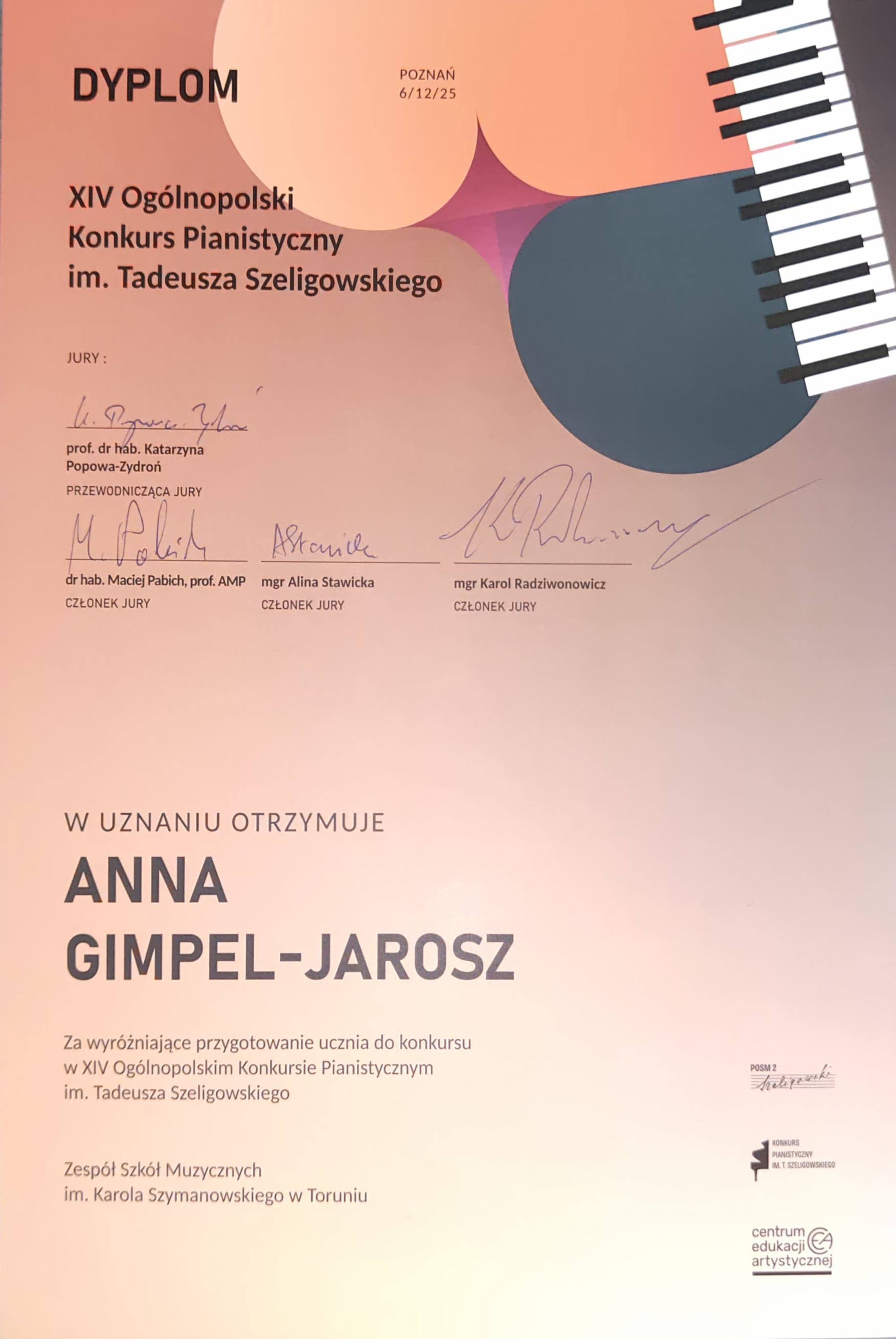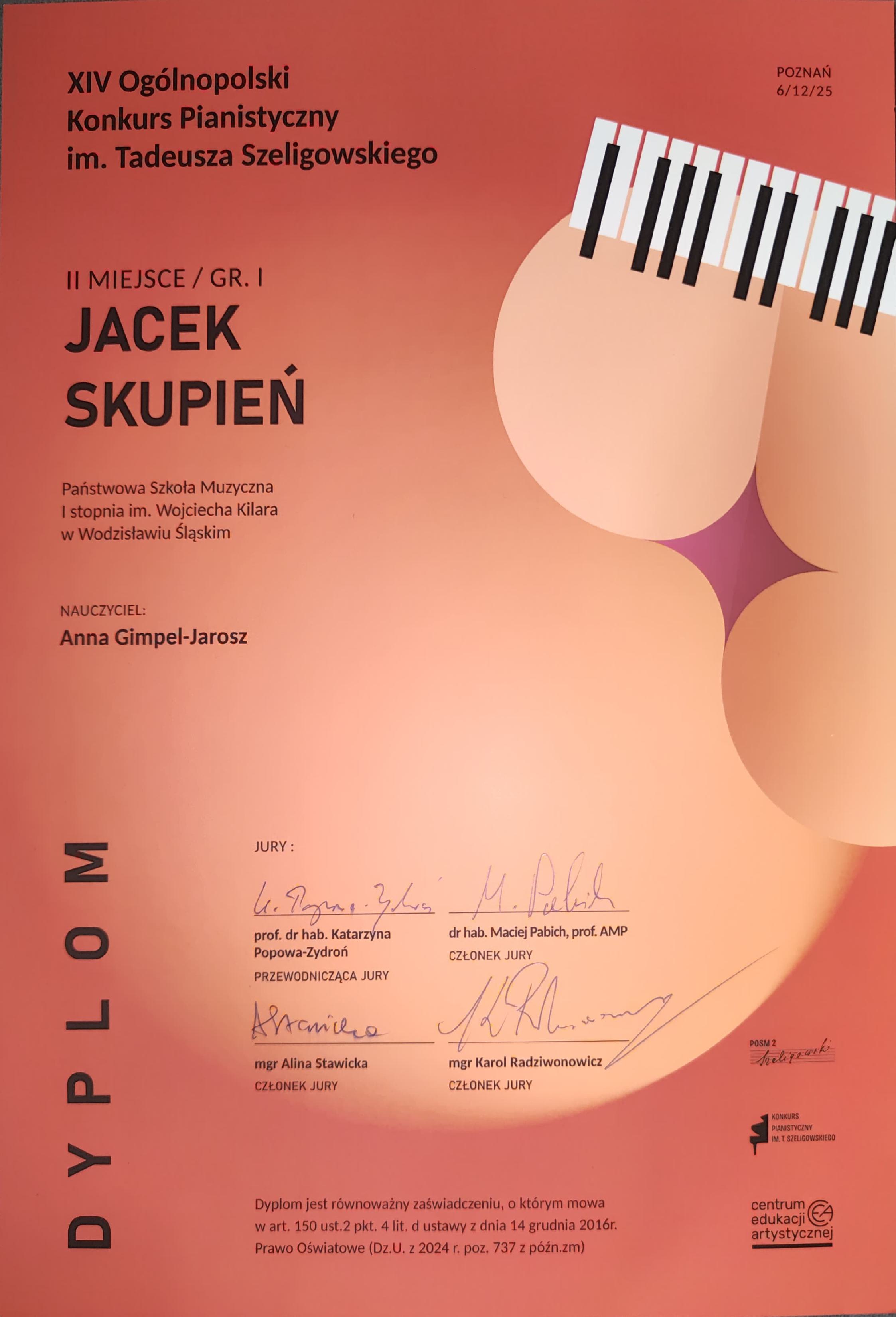 Wielkie brawa dla Jacka Skupnia! Uczeń klasy fortepianu pani Anny Gimpel-Jarosz zdobył II miejsce na XIV Ogólnopolskim Konkursie Pianistycznym im. Tadeusza Szeligowskiego w Poznaniu!