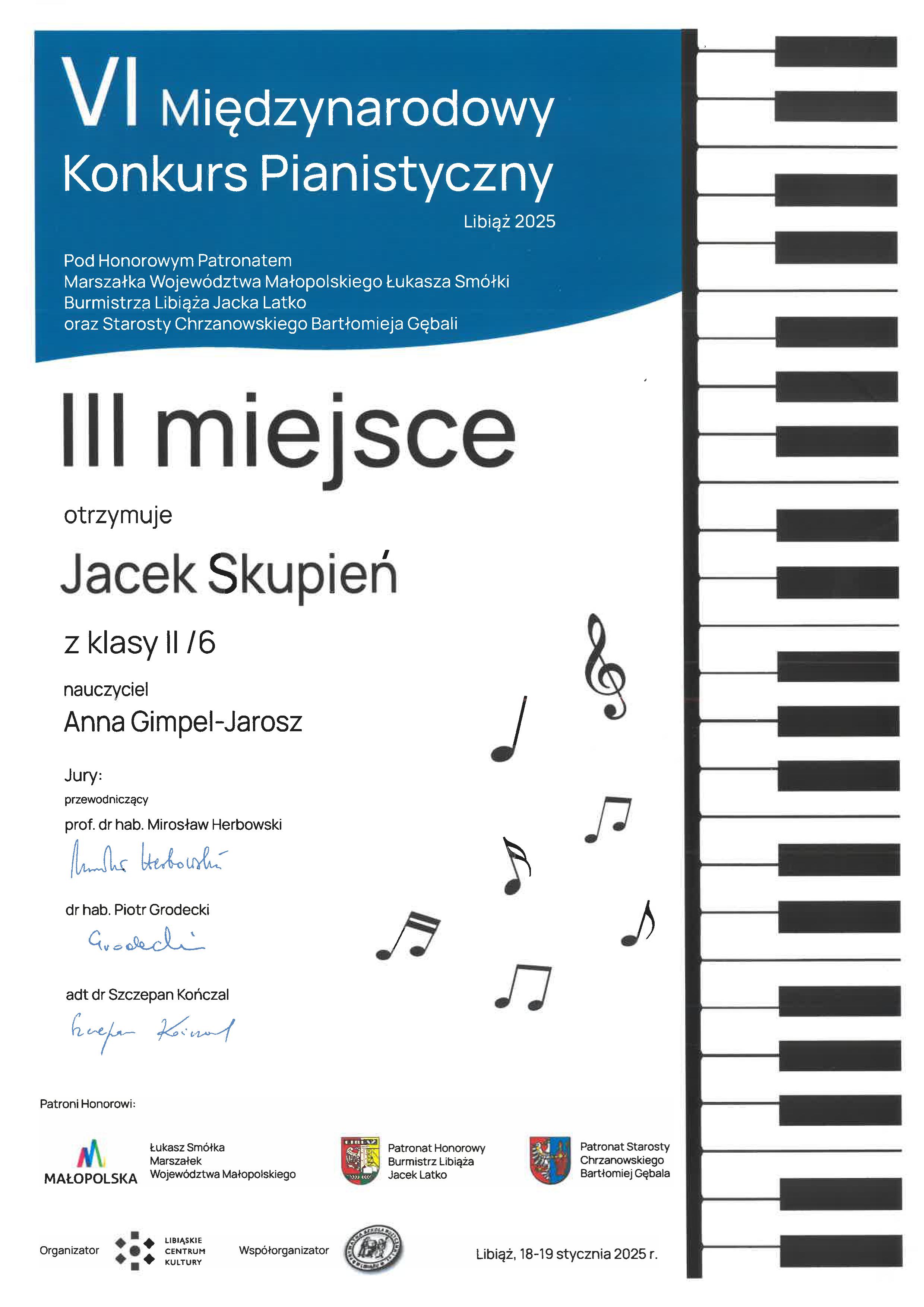 III miejsce dla Jacka 19.01.2025 Jacek Skupień uczeń klasy fortepianu p. Anny Gimpel-Jarosz zajął III miejsce na VI Międzynarodowym Konkursie Pianistycznym w Libiążu. Serdecznie gratulujemy! Zdjęcia (2) Pokaż zdjęcie 1 z galerii. Pokaż zdjęcie 2 z galerii.