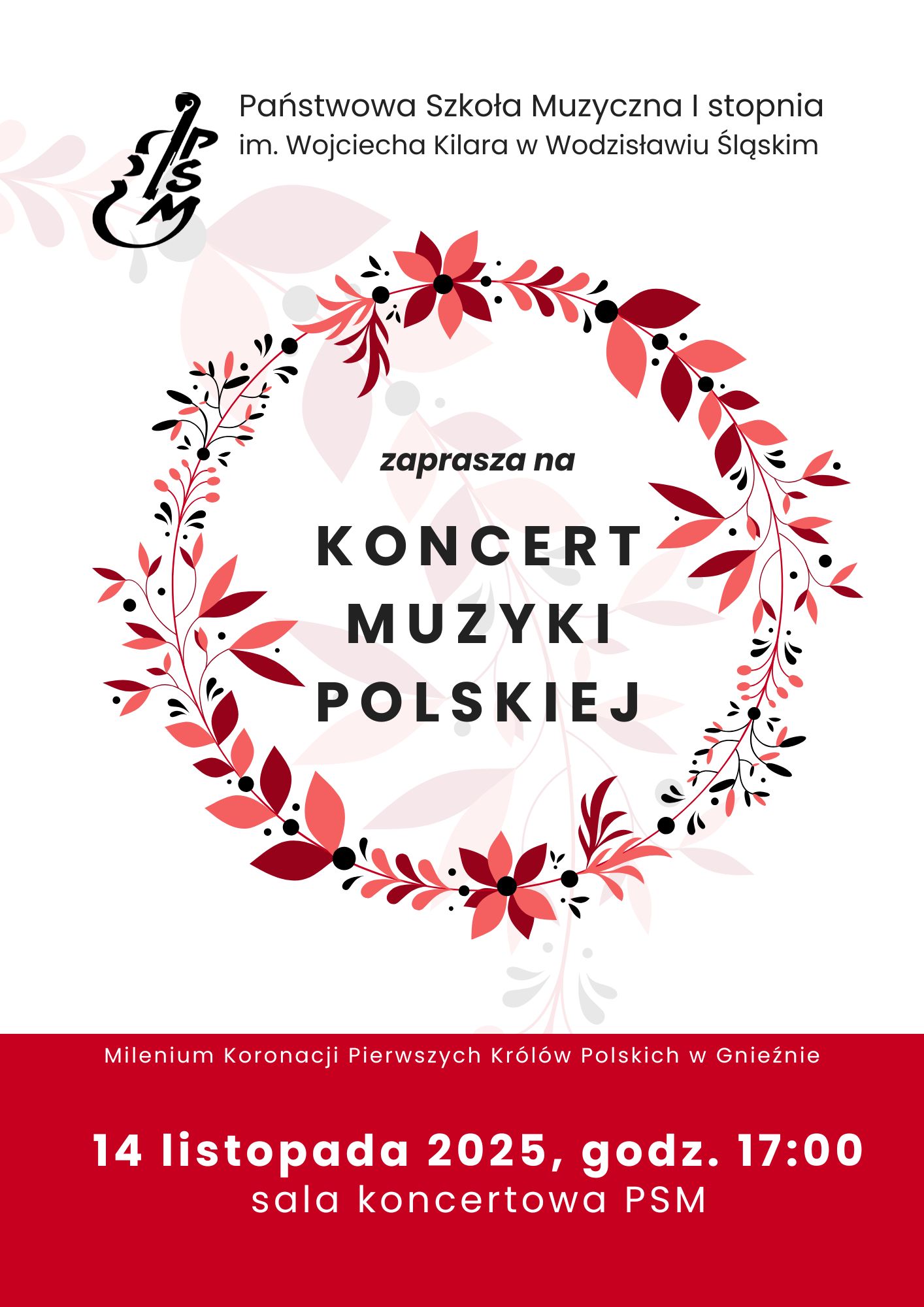 Państwowa Szkoła Muzyczna I stopnia im. Wojciecha Kilara w Wodzisławiu Śląskim ma zaszczyt zaprosić na Koncert Muzyki Polskiej w Milenium Koronacji Pierwszych Królów Polskich w Gnieźnie, który odbędzie się 14 listopada 2025 r. (piątek) o godzinie 17:00 w sali koncertowej PSM. W programie utwory Wojciecha Kilara oraz innych wybitnych polskich kompozytorów w wykonaniu uczniów naszej szkoły.