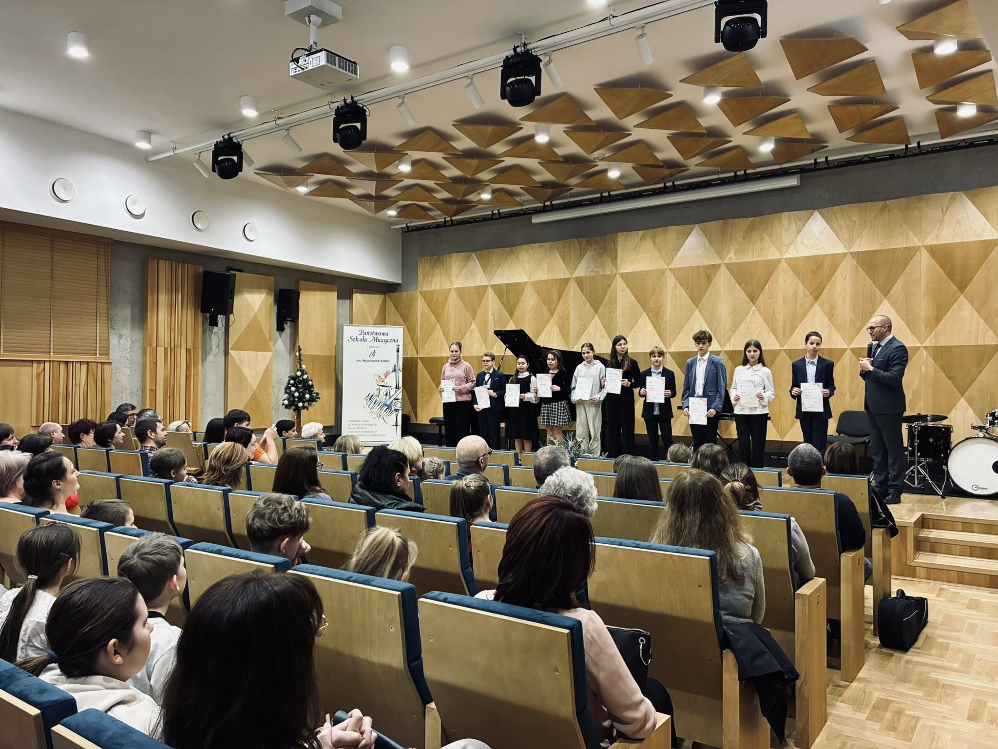 Podczas koncertu Pan Dyrektor wręczył również nagrody – stypendia dla najzdolniejszych uczniów, doceniając ich talent, wytrwałość i szczególne osiągnięcia artystyczne.