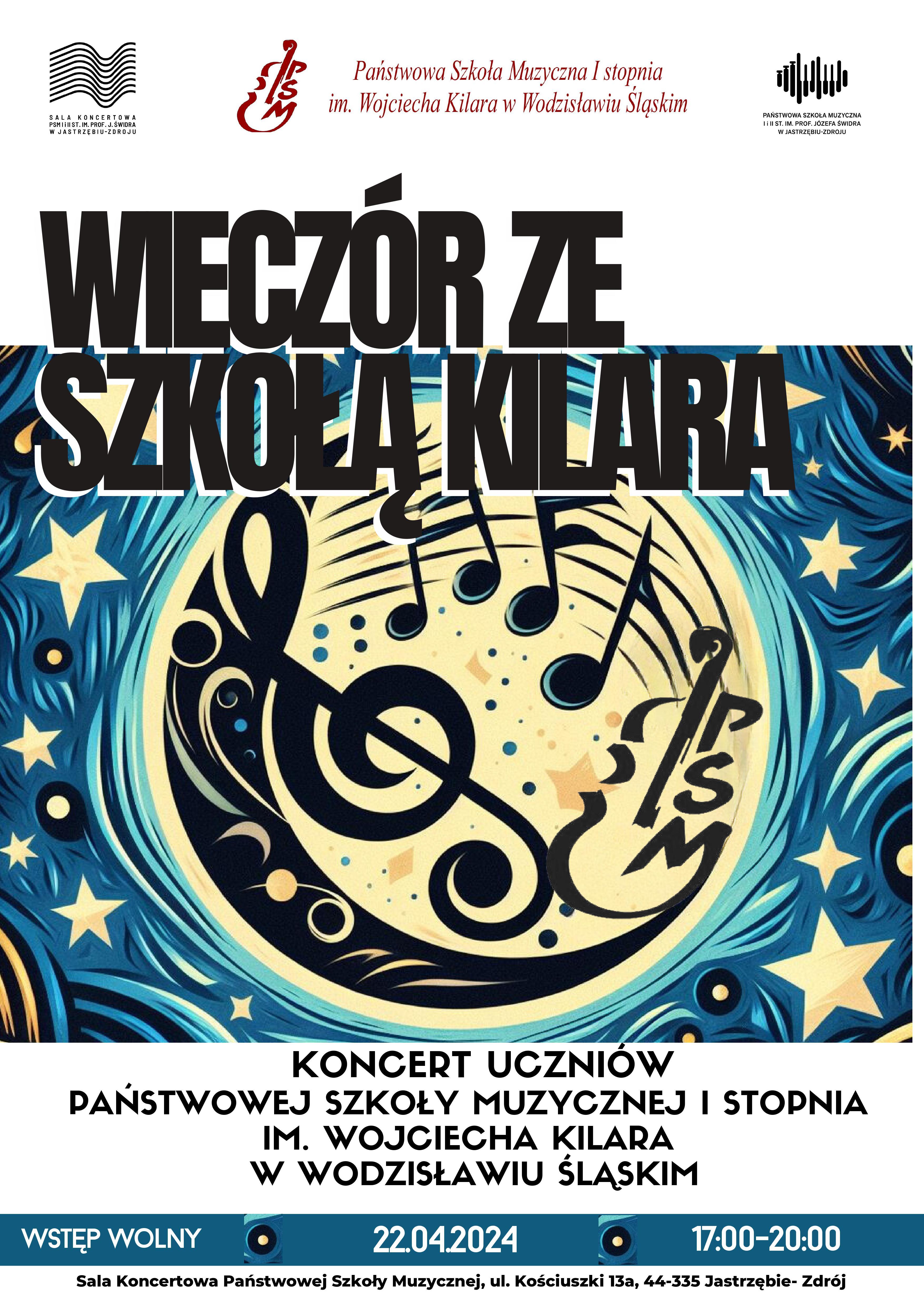 22 kwietnia 2024 w Państwowej Szkole Muzycznej I i II stopnia im. prof. Józefa Świdra w Jastrzębiu Zdroju odbędzie się gościnny występ uczniów naszej szkoły. Koncert zatytułowany "Wieczór ze Szkołą Kilara" rozpocznie się o godz. 17:00. Zapraszamy!