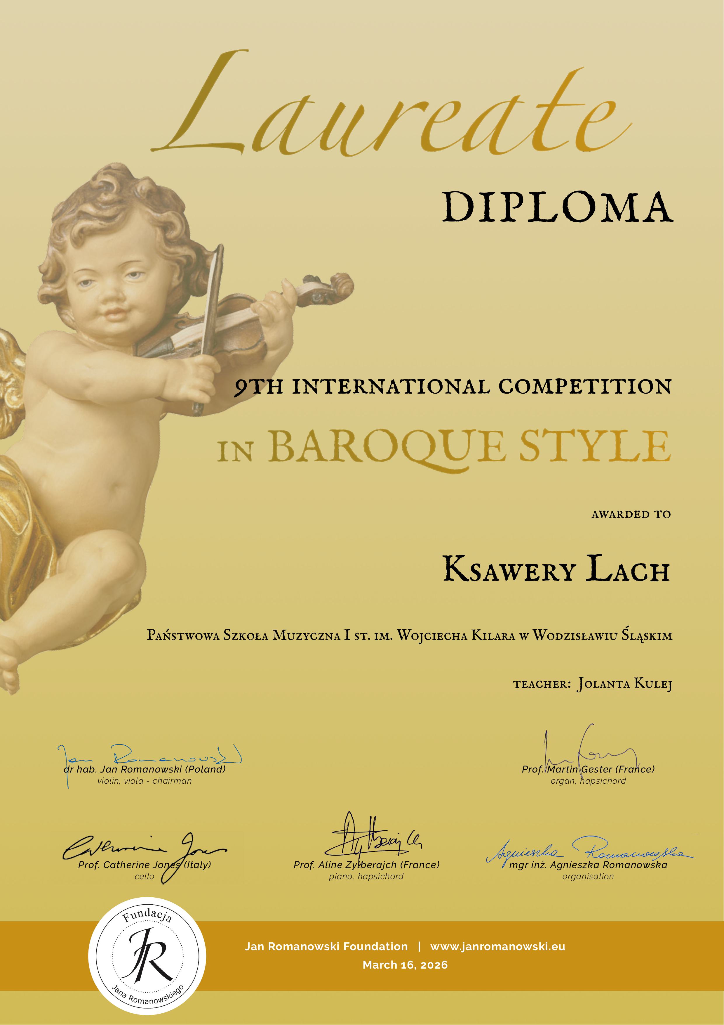 Ksawery Lach, uczeń klasy fortepianu pani Jolanty Kulej zdobył tytuł laureata na IX Międzynarodowym Konkursie "w Barokowym Stylu”.