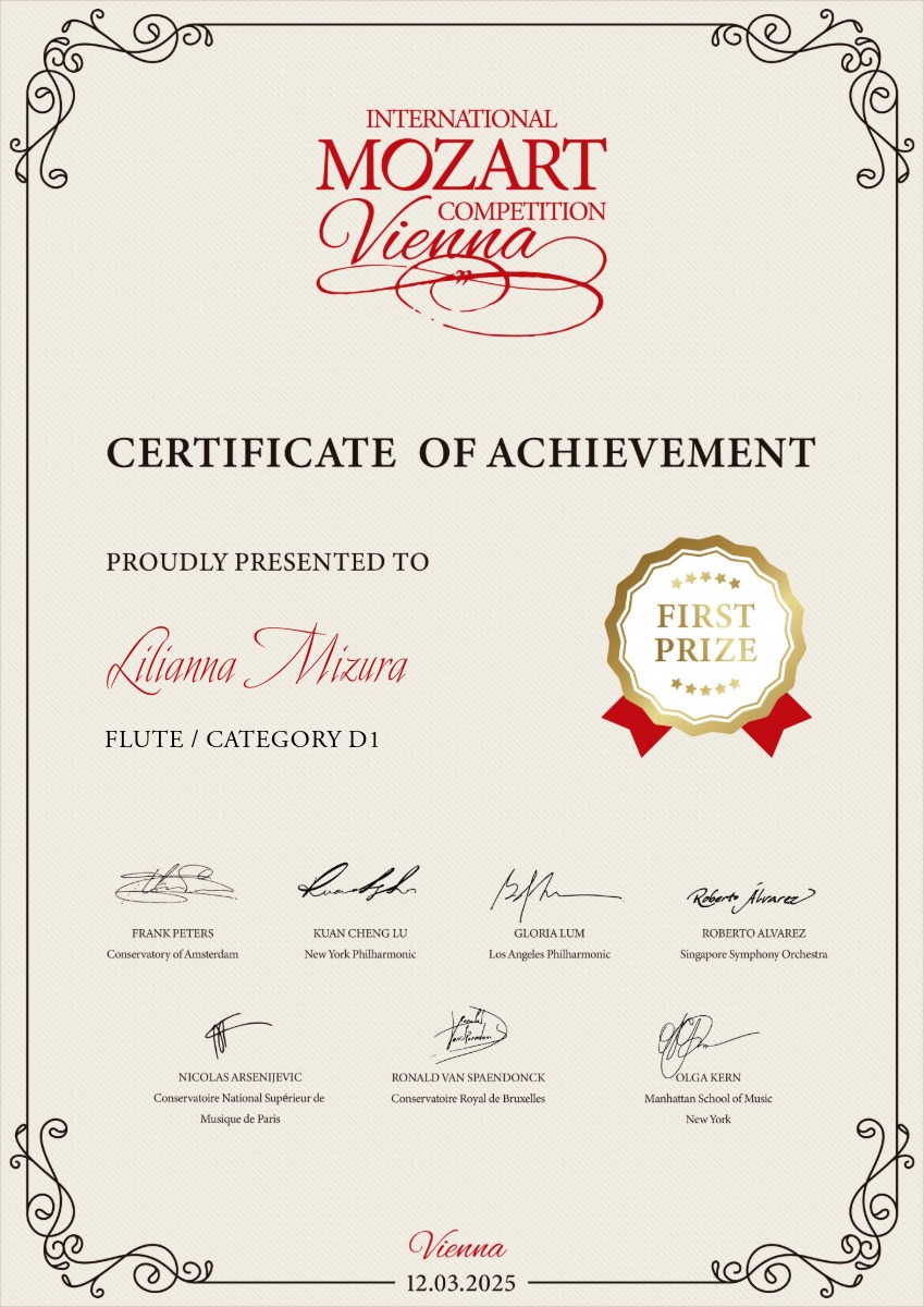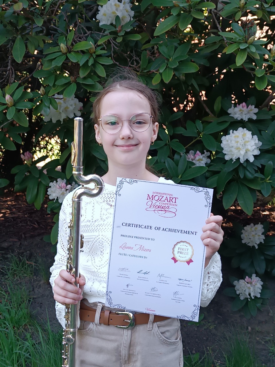 Lilianna Mizura zdobyła I miejsce na konkursie International MOZART Competition w Wiedniu. Lilianka jest uczennicą klasy fletu pani Katarzyny Starzec-Kawalec. Serdeczne podziękowania dla pani Agaty Czyż za wspaniały akompaniament. Gratulacje!!!