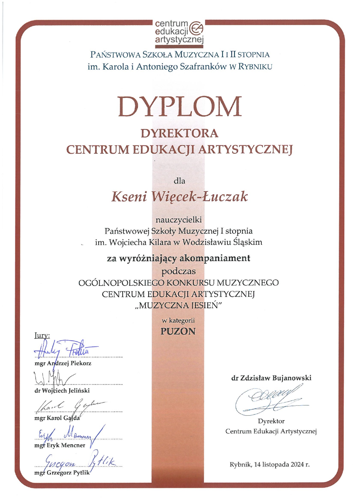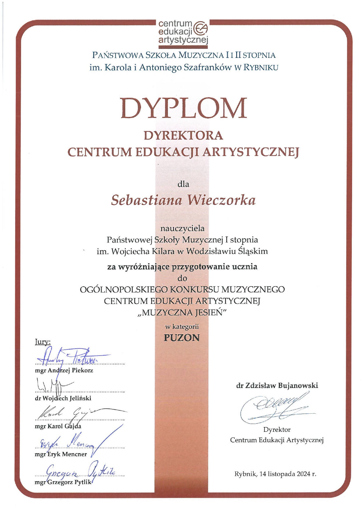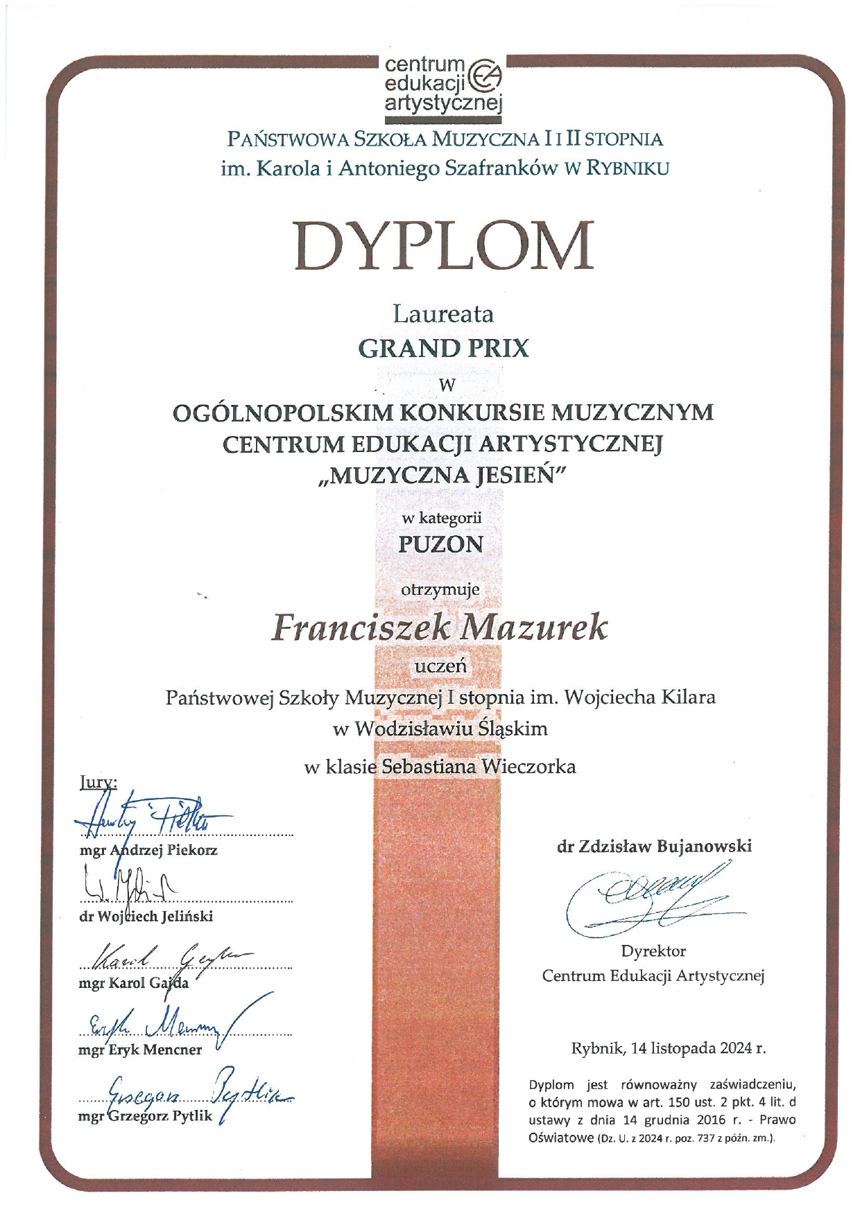 14 listopada 2024 w PSM I i II stopnia w Rybniku odbył się Ogólnopolski Konkurs Muzyczny Centrum Edukacji Artystycznej "Muzyczna Jesień" 2024 - kategoria PUZON dla uczniów szkół muzycznych I stopnia. Franciszek Mazurek, uczeń p. Sebastiana Wieczorka zdobył nagrodę główną - GRAND PRIX - gratulujemy!!!