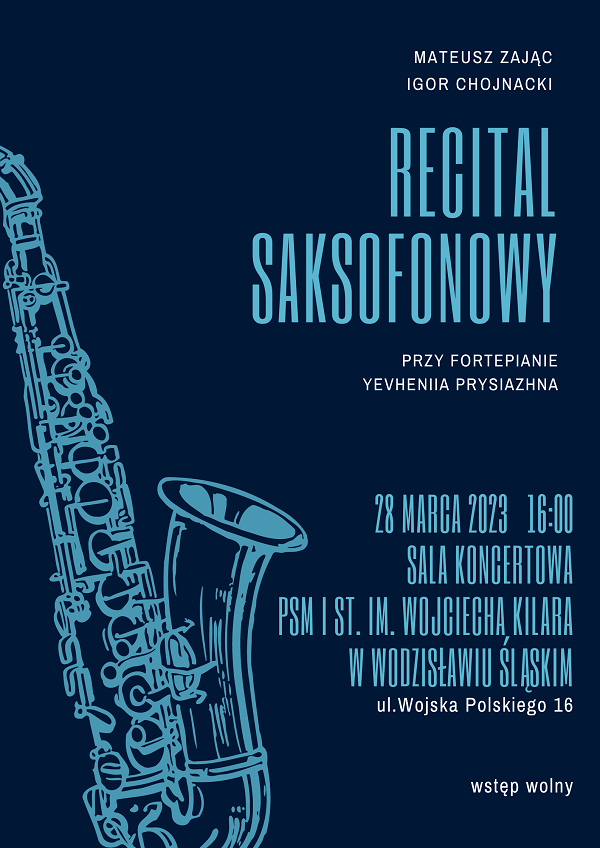 Zapraszamy na recital saksofonowy we wtorek 28 marca o godzinie 16:00. Zagrają Mateusz Zając, Igor Chojnacki i Yevheniia Prysiazhna.