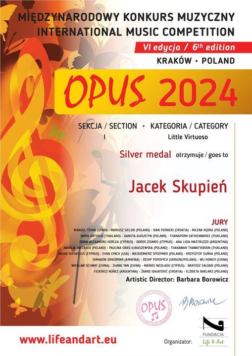 Jacek Skupień uczeń klasy fortepianu Pani Anny Gimpel-Jarosz otrzymał Silver medal na Międzynarodowym Konkursie Muzycznym International Music Competition Krakow - Poland Opus 2024 r. Gratulujemy!
