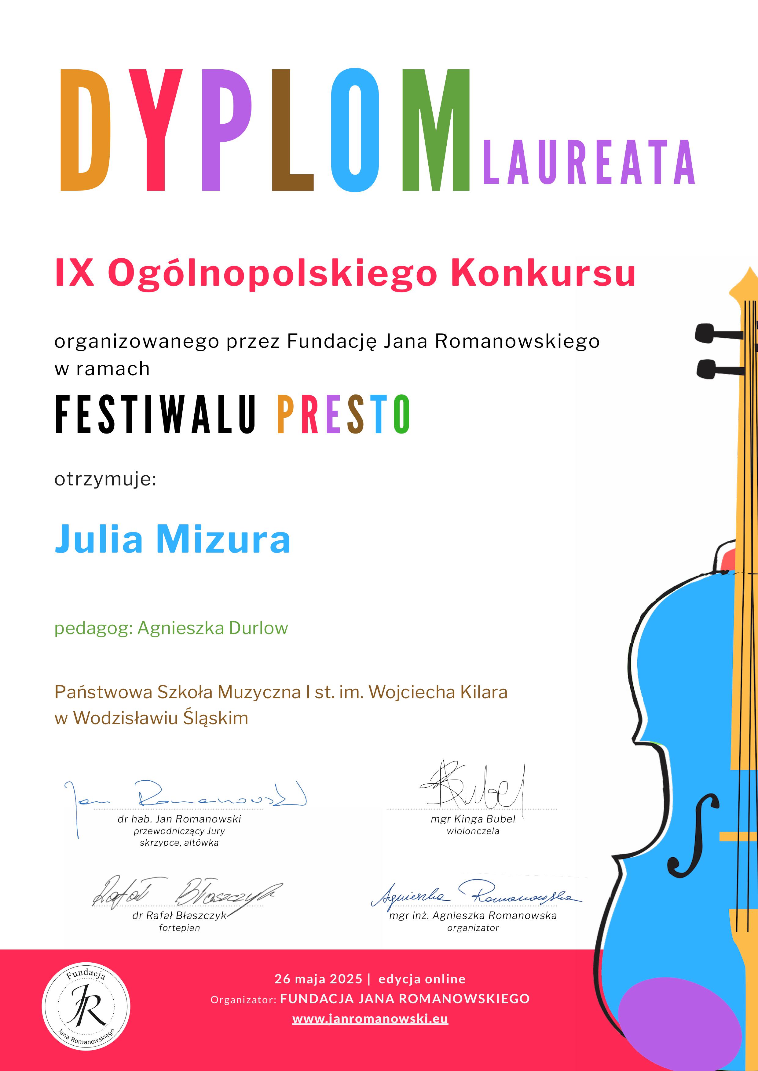 Julia Mizura z klasy skrzypiec pani Agnieszki Durlow zdobyła tytuł LAUREATA na ogólnopolskim Festiwalu PRESTO 2025. Julce akompaniowała pani Agata Czyż. Serdecznie gratulujemy i życzymy dalszych sukcesów!!