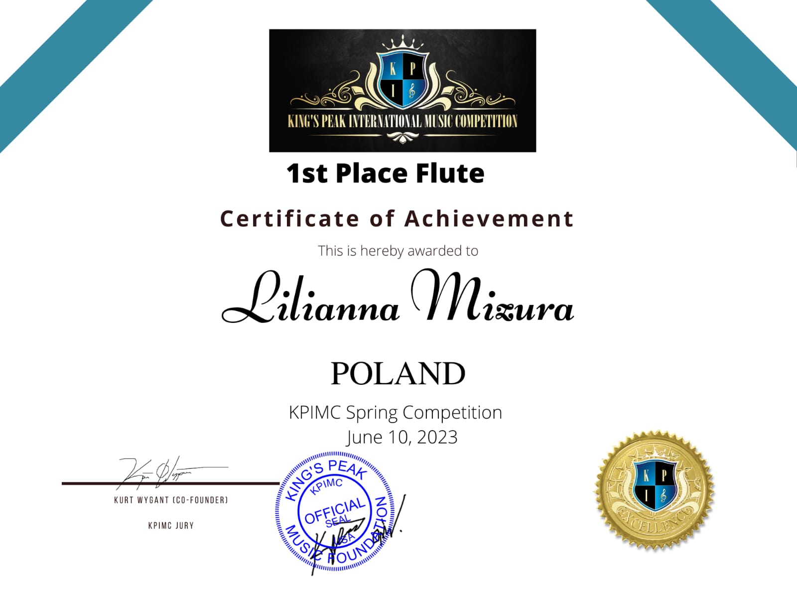 Lilianna Mizura z klasy fletu Katarzyny Starzec-Kawalec została laureatką I miejsca w KING'S PEAK MUSIC COMPETITION w USA. Lilianka jest uczennicą klasy I. Serdeczne Gratulacje dla niej i akompaniującej pani Gizeli Fritz