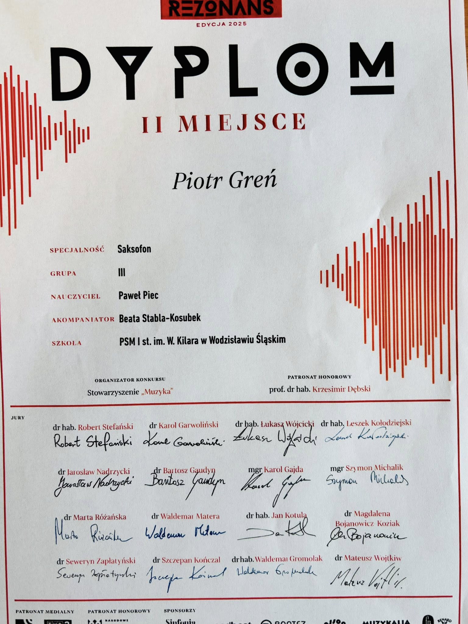 W Ogólnopolskim Konkursie Instrumentalnym REZONANS Piotr Greń zajął II miejsce. Piotrek jest uczniem klasy saksofonu Pana Pawła Pieca. W konkursowych utworach na fortepianie towarzyszyła mu pani Beata Stabla-Kosubek.