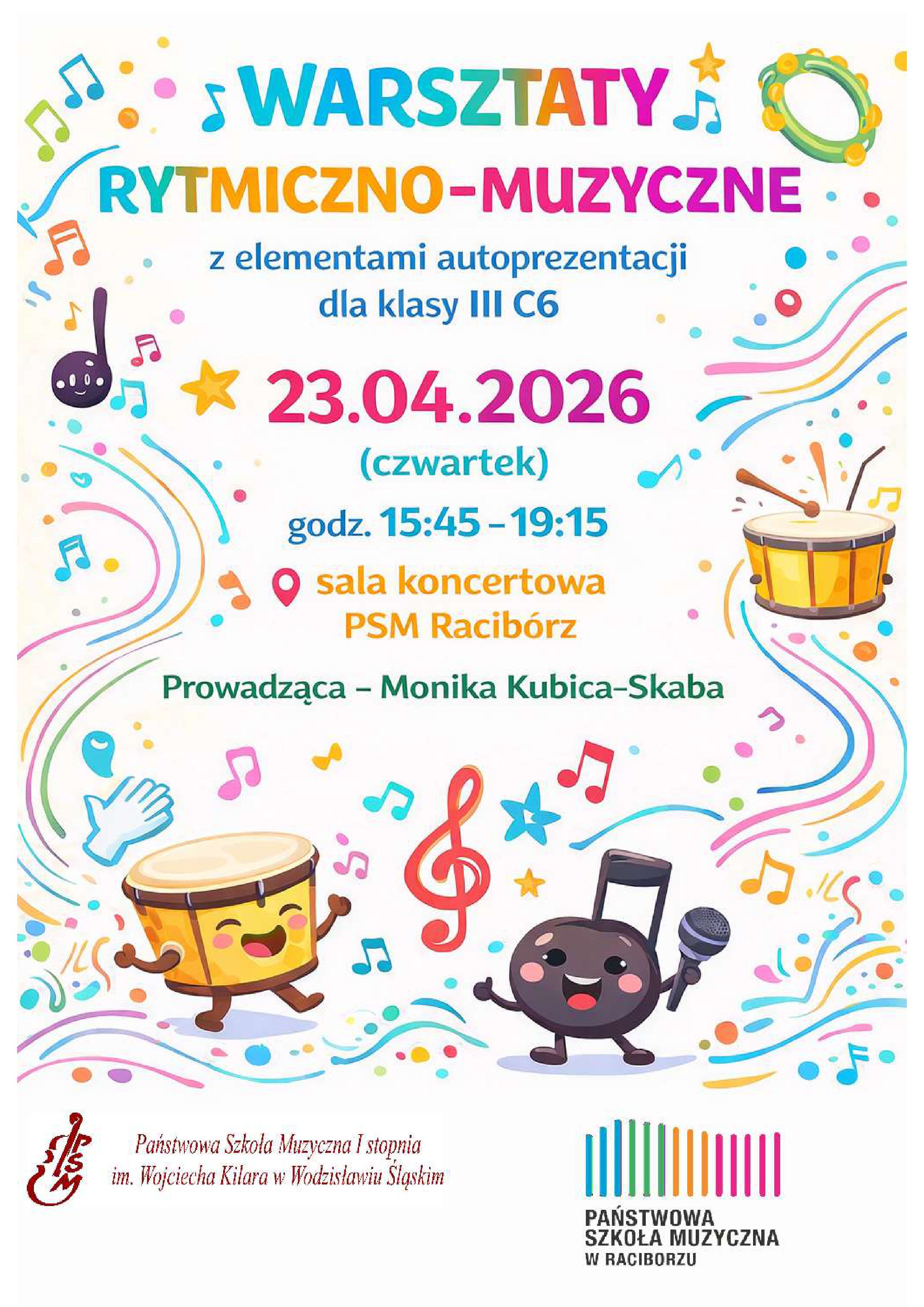 23 kwietnia 2026 uczniowie klas IIIc6 wezmą udział w warsztatach rytmiczno-muzycznych z elementami autoprezentacji we współpracy z PSM w Raciborzu. Warsztaty poprowadzi pani Monika Kubica-Skaba.