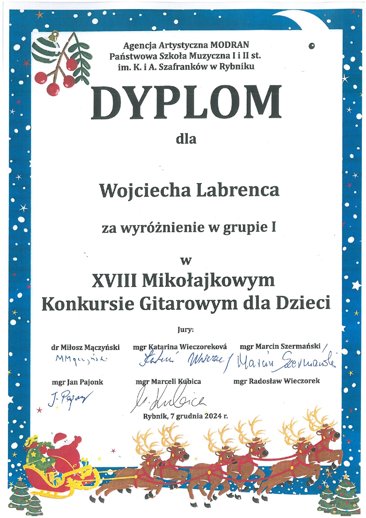 Nasi gitarzyści, Wojciech Labrenc - uczeń pana Piotra Bobera i Dawid Panic uczeń pana Marcelego Kubicy zdobyli wyróżnienia w XVIII Mikołajkowym Konkursie Gitarowym dla Dzieci w Rybniku. Serdeczne gratulacje dla młodych artystów i ich nauczycieli!