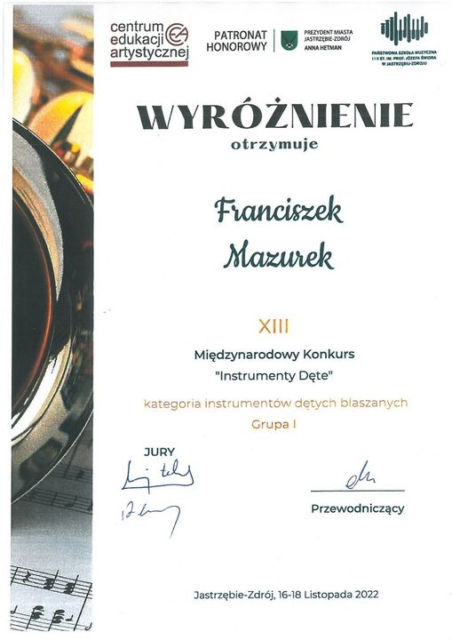 Franciszek Mazurek z klasy puzonu p. Sebastiana Wieczorka zdobył wyróżnienie na XIII Międzynarodowym Konkursie "Instrumenty Dęte" w Jastrzębiu Zdroju.