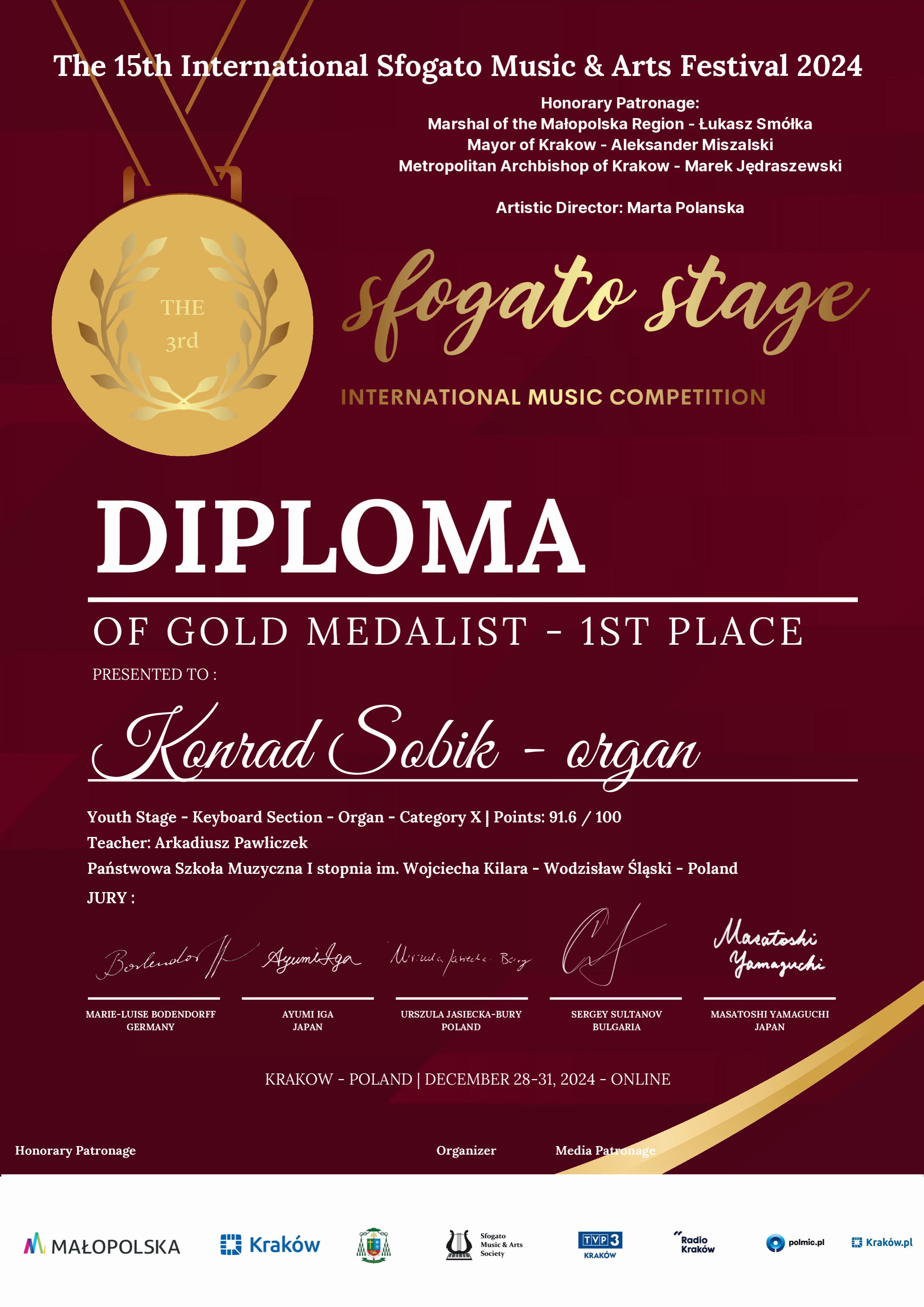 Dotarła do nas radosna wiadomość! Konrad Sobik, uczeń klasy organów pana Arkadiusza Pawliczka, zdobył w swojej kategorii I nagrodę w III Międzynarodowym Konkursie Muzycznym Sfotago Stage 2024. Gratulujemy Konradowi sukcesu!