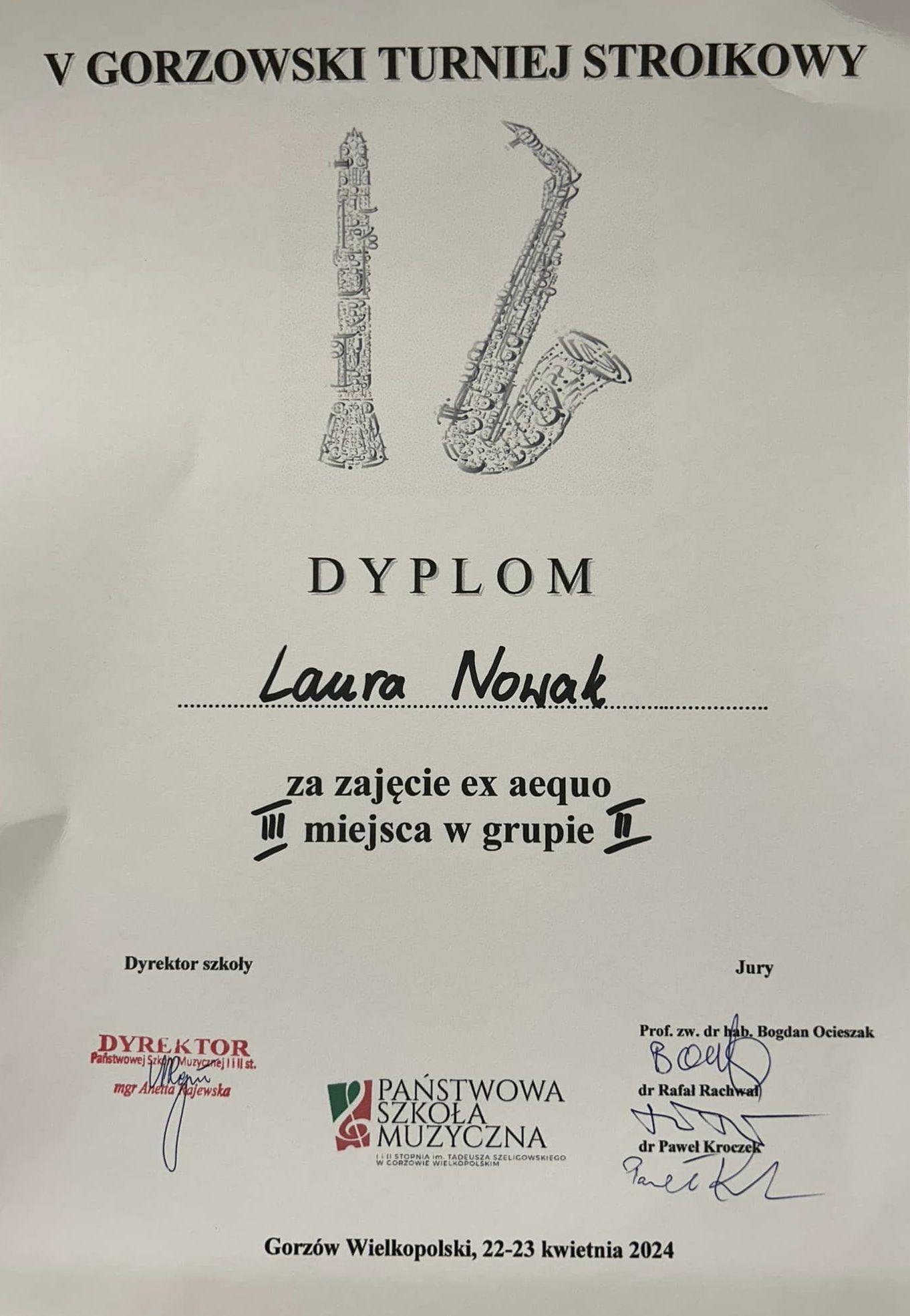 W dniach 22-23 kwietnia 2024 roku odbywał się V Gorzowski Turniej Stroikowy. Laura Nowak, nasza uczennica z klasy pana Mirosława jędrzejewskiego zajęła na nim III miejsce. Młodej saksofonistce akompaniowała pani Elwira Janiec-Krajewska. Gratulujemy naszej zdolnej uczennicy kolejnego już sukcesu.