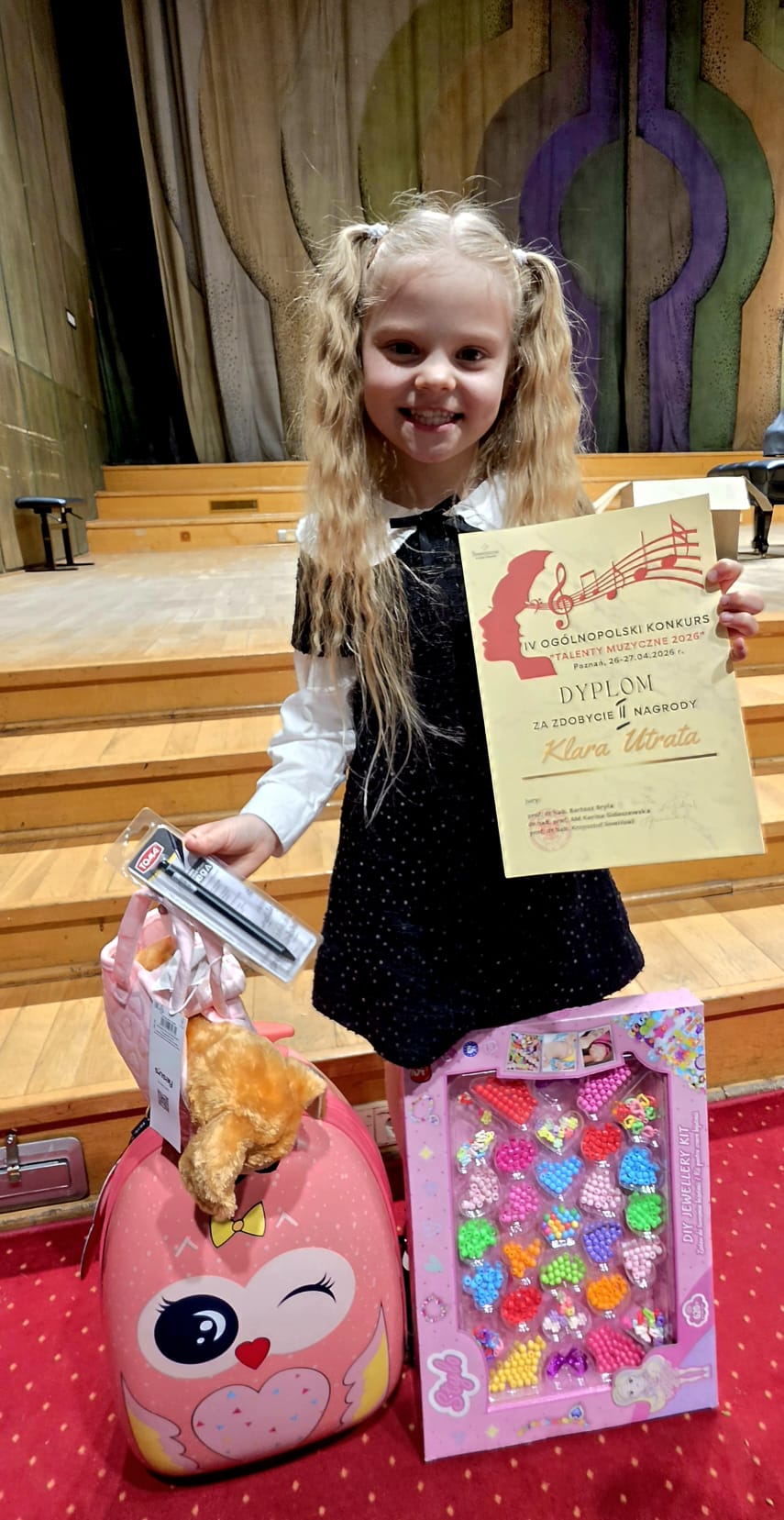 W niedzielę 26 kwietnia 2026 roku w POSM II st. im. M. Karłowicza w Poznaniu odbyła się kolejna edycja Ogólnopolskiego Konkursu "Talenty Muzyczne 2026". W grupie pierwszej, liczącej aż 64 uczestników zaprezentowała się Klara Utrata, nasza młodziutka pianistka z klasy pani Jagody Młynarskiej. Występ zakończył się sukcesem, bowiem jury nagrodziło Klarę II miejscem. Jesteśmy dumni z naszej uczennicy.