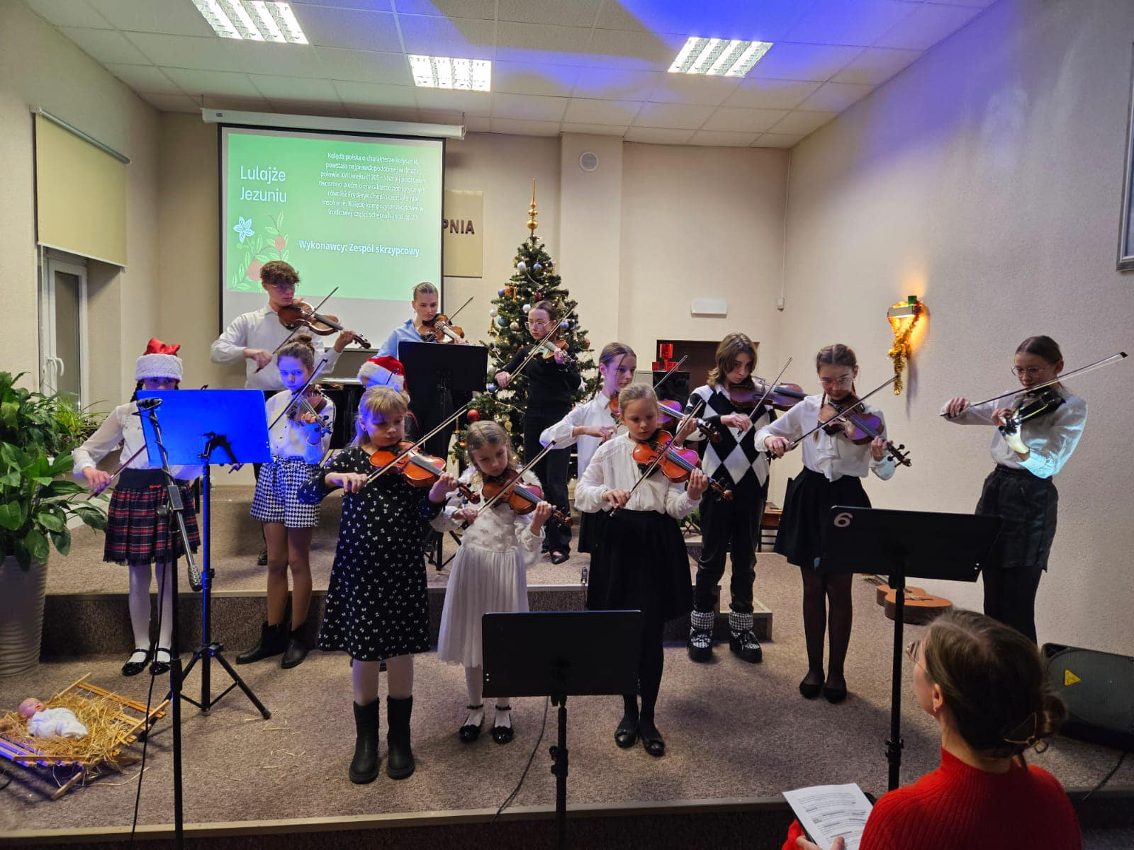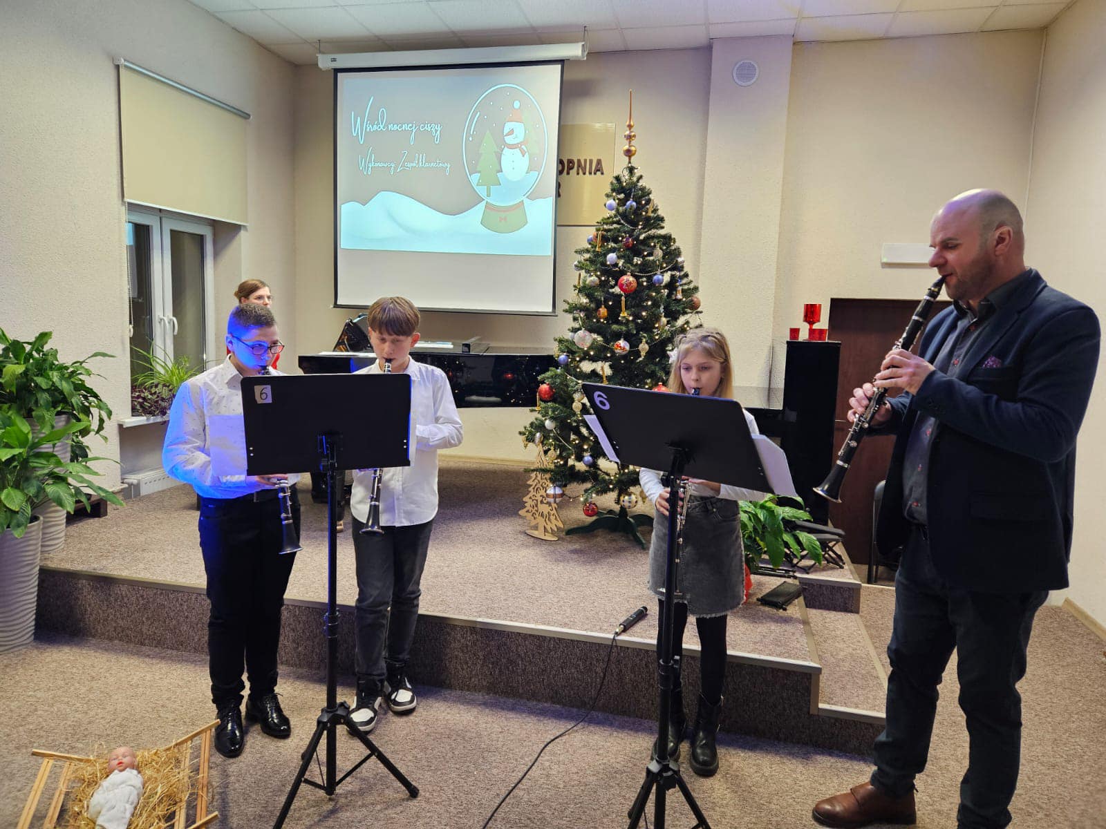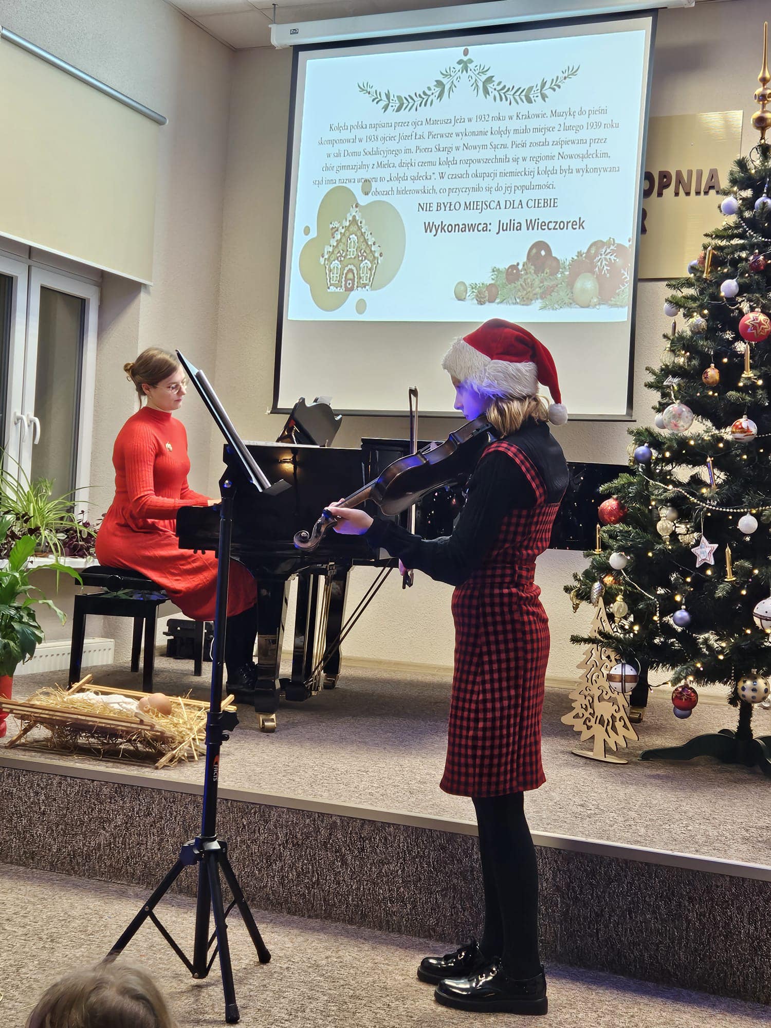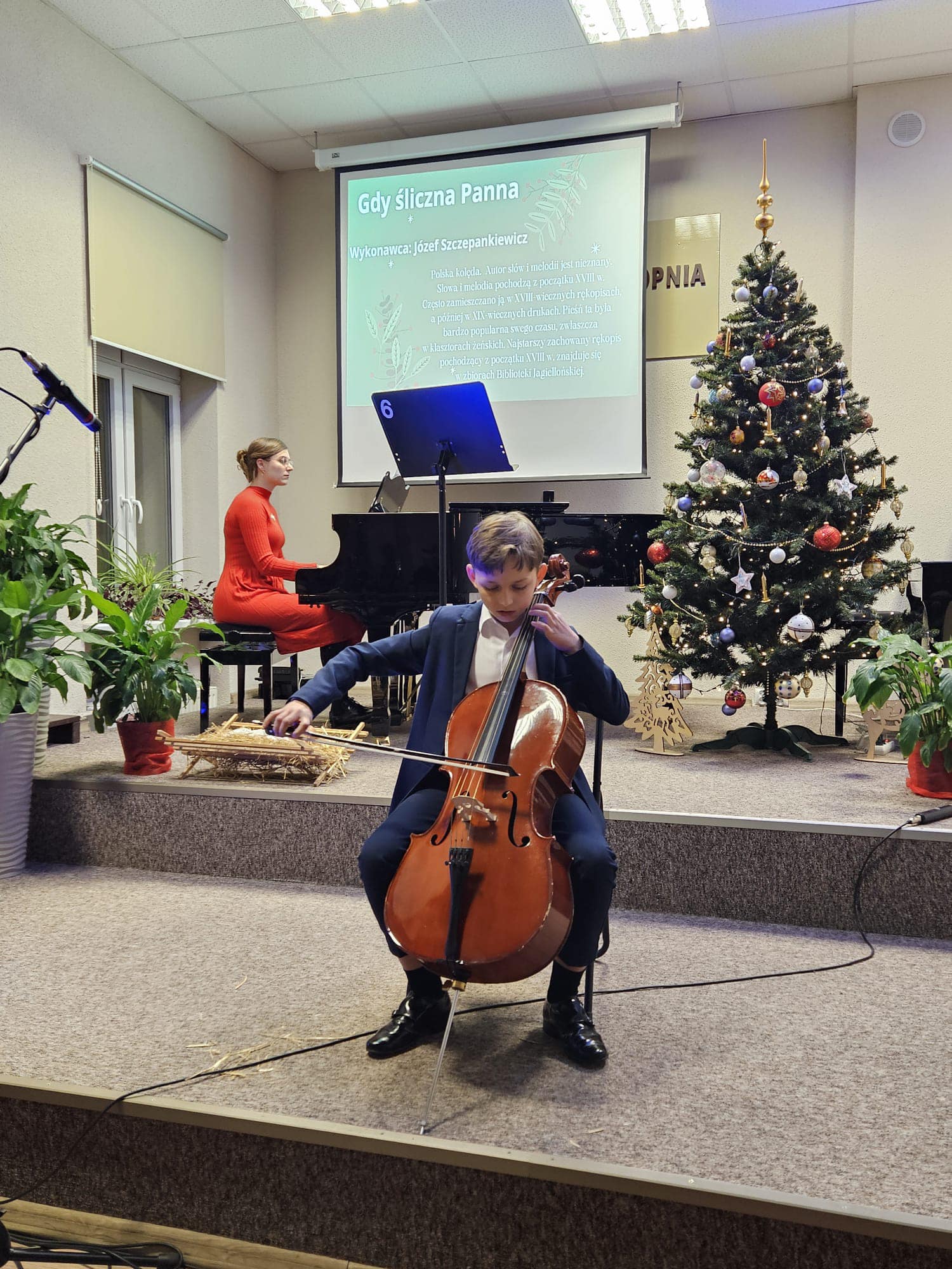 W środowe popołudnie 20 grudnia odbył się Koncert Kolęd. Sala kameralna zapełniła się słuchaczami, którzy spędzili czas w niezwykłej, przedświątecznej atmosferze. Na scenie prezentowali się nasi zdolni uczniowie grając kolędy i pastorałki. Wystąpili też uczniowie klasy 2 cyklu 6-letniego w krótkim świątecznym przedstawieniu. Koncert zakończył się wspólnym zaśpiewaniem kolęd.