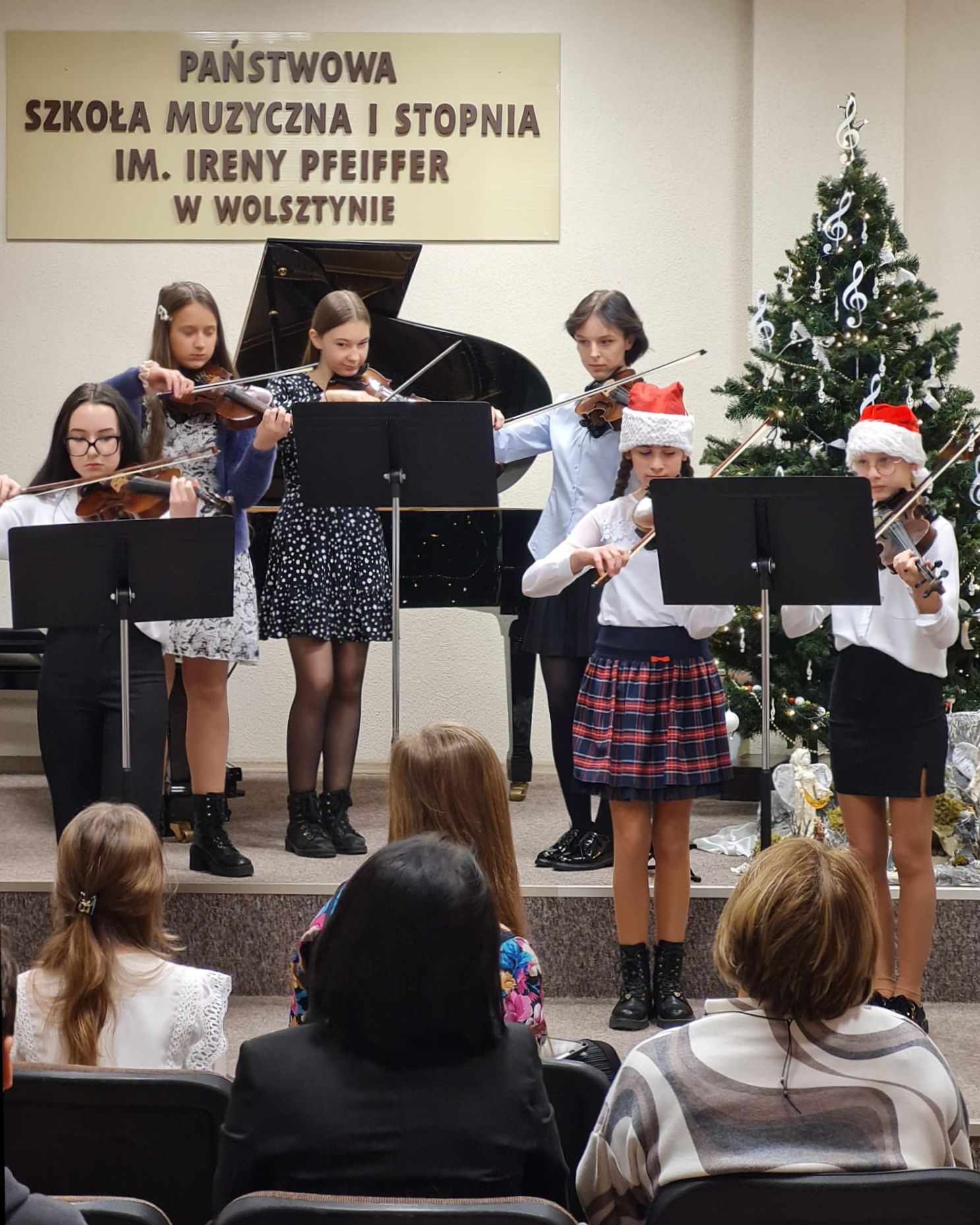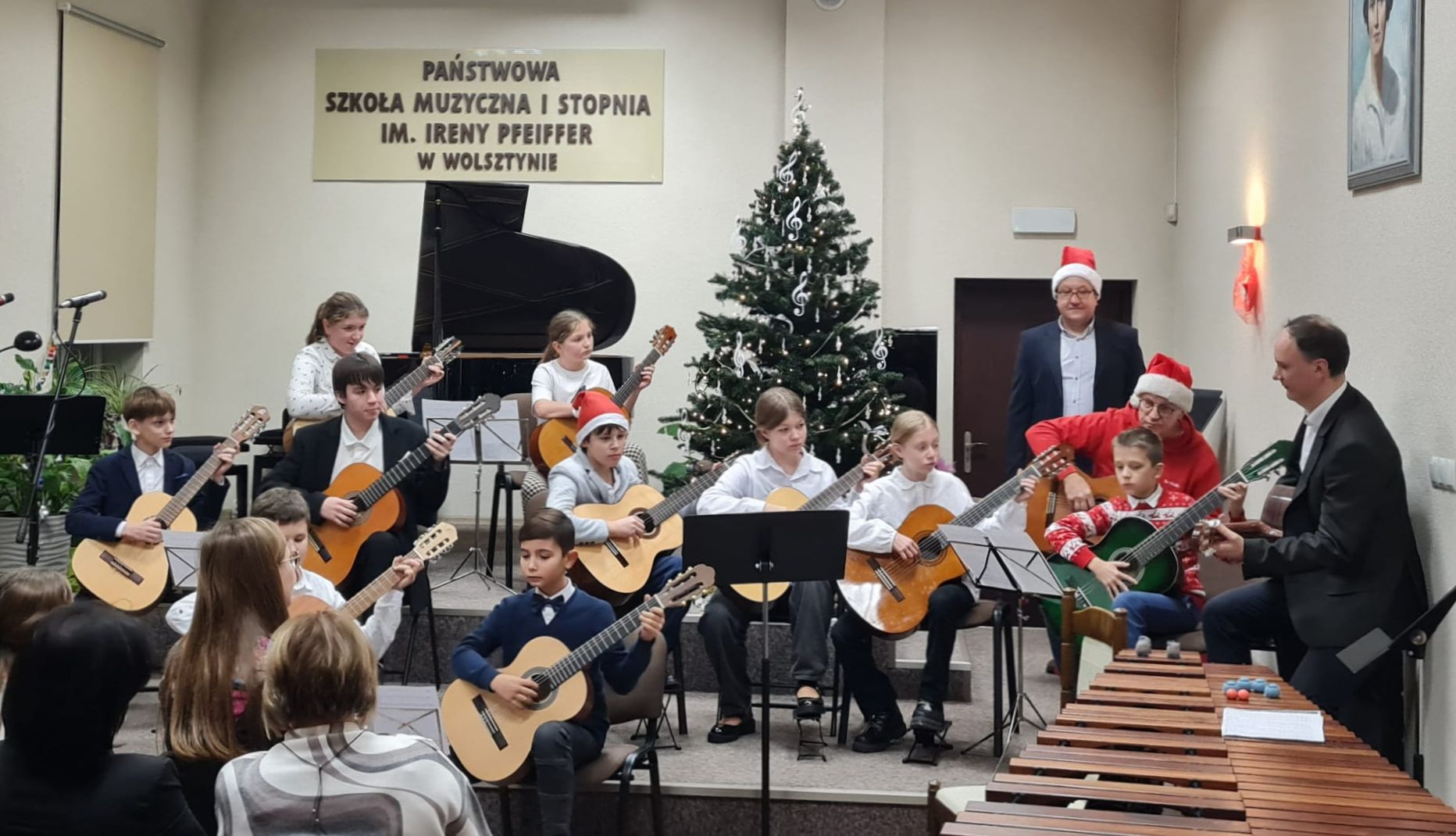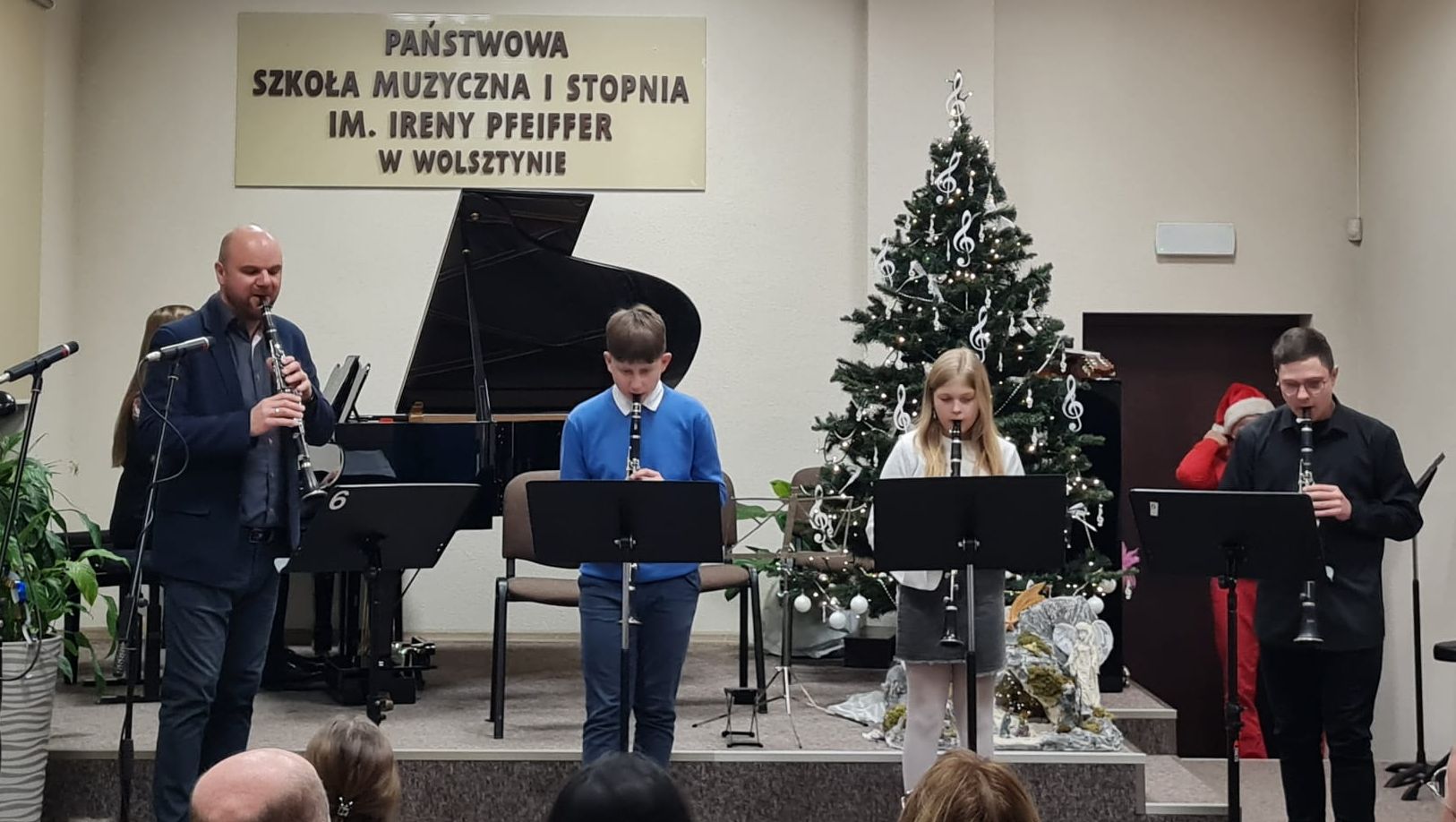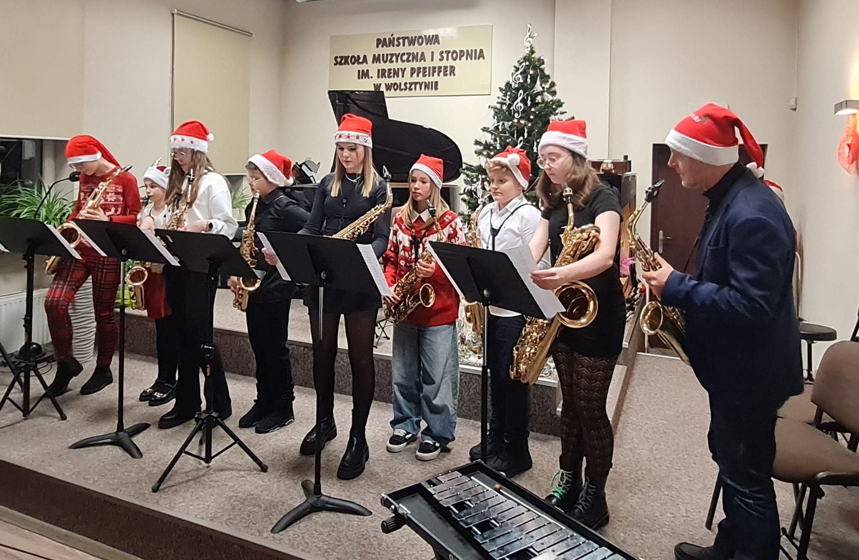 Świąteczny Koncert w Szkole Muzycznej odbył się 18 grudnia i zachwycił liczną publiczność magicznymi dźwiękami. Uczniowie zaprezentowali zarówno klasyczne kolędy, jak i świąteczne piosenki. Szczególną uwagę przyciągnęły występy zespołów instrumentalnych - saksofonowego, klarnetowego, perkusyjnego, skrzypcowego, wiolonczelowego i gitarowego. Obok zespołów na scenie zaprezentowali się także soliści, a występy wszystkich naszych młodych muzyków stworzyły niezapomnianą atmosferę i wprowadziły słuchaczy w świąteczny nastrój.