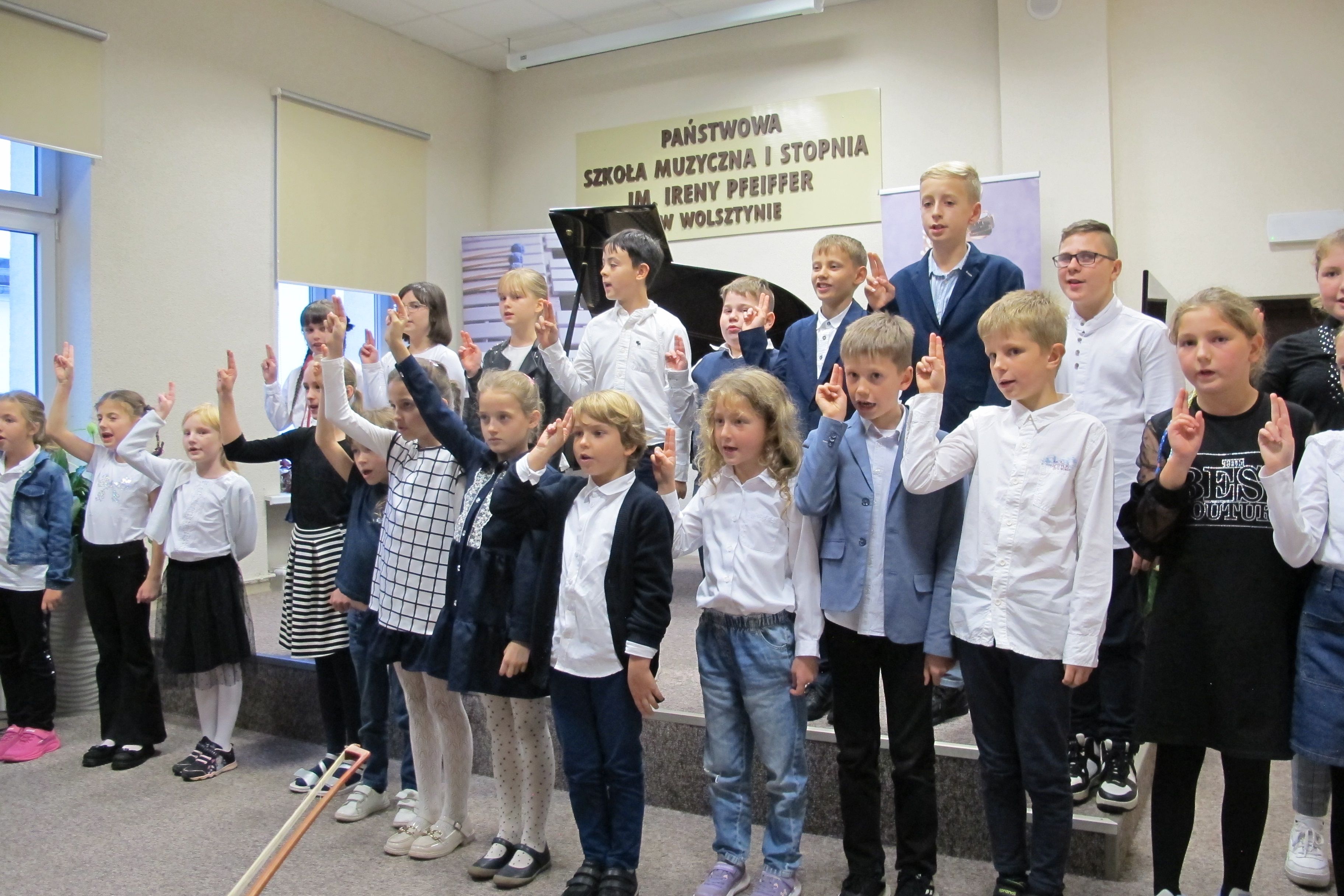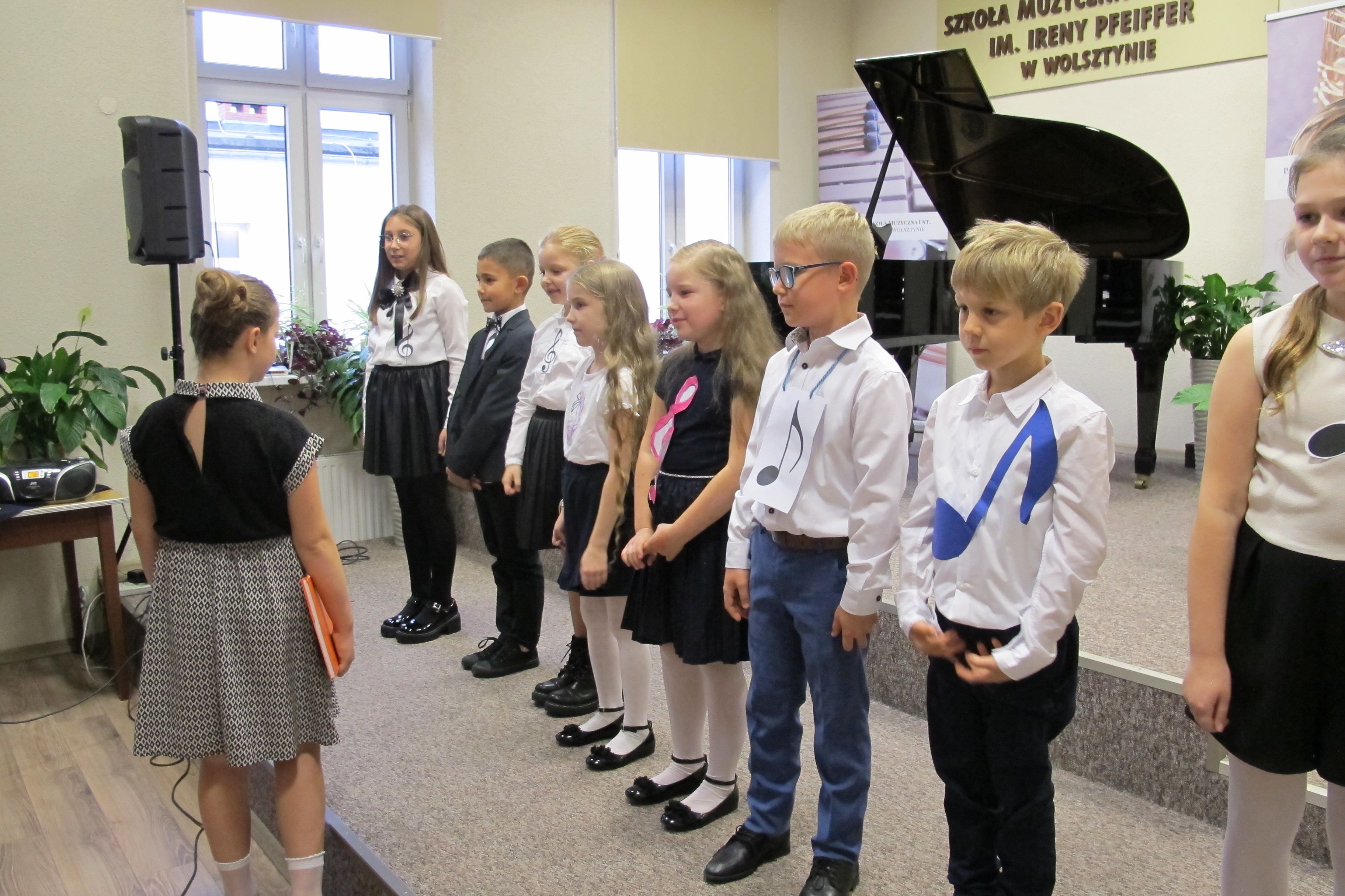 W czwartek 12 października 2023 roku odbył się koncert z okazji Dnia Edukacji Narodowej oraz Pasowania Uczniów Klas Pierwszych. Tę podwójną uroczystość zaszczycił swą obecnością burmistrz Wolsztyna, pan Wojciech Lis. Ze sceny popłynęły ciepłe życzenia dla grona pedagogicznego oraz pracowników administracji i obsługi. Pani Dyrektor wręczyła nagrody jubileuszowe i nagrody dyrektora. Na scenie zaprezentowała się klasa 2 cyklu 6-letniego z piosenką "Nasza Pani", pojawili się także insrtumentaliści - gitarzystka Emilia Dudzińska, akordeonistka Zofia Ślebioda oraz duet fortepianowy Michalina Krupa i Jagoda Stachowiak. W drugiej części koncertu na scenę wkroczyli uczniowie klas pierwszych, którzy złożyli uroczyste ślubowanie. Następnie Pani Dyrektor pasowała ich na uczniów naszej szkoły, a Rada Rodziców obdarowała ich upominkami. Zwieńczeniem uroczystości był występ naszych dwóch młodych nauczycielek, pani Jagody Stachowiak i pani Anieli Madery, które wykonały utwór na dwa fortepiany.