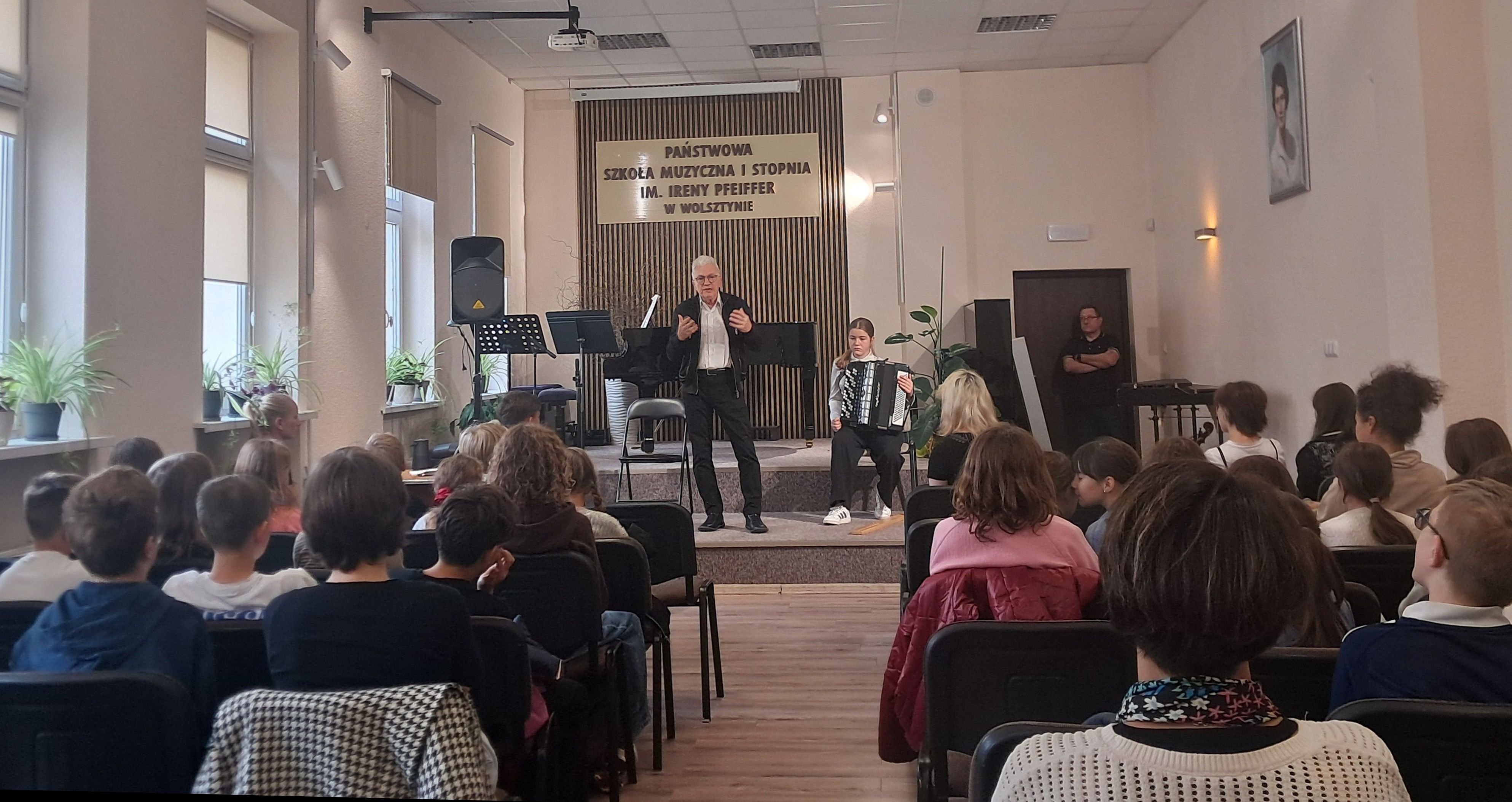 1 października z okazji Międzynarodowego Dnia Muzyki gościliśmy w naszej szkole uczniów z Niepublicznej Szkoły Podstawowej BLOOM w Wolsztynie. Przygotowaliśmy dla nich krótki koncert, dzięki któremu goście mogli się dokładniej zapoznać z instrumentami, na których uczymy grać. Pan Wojciech Warszawski poprowadził koncert i zapoznał uczniów z genezą święta muzyki. Solistom akompaniowała pani Jagoda Młynarska. Po koncercie nasi mili goście mieli okazję zwiedzić szkołę i poczuć jej atmosferę.