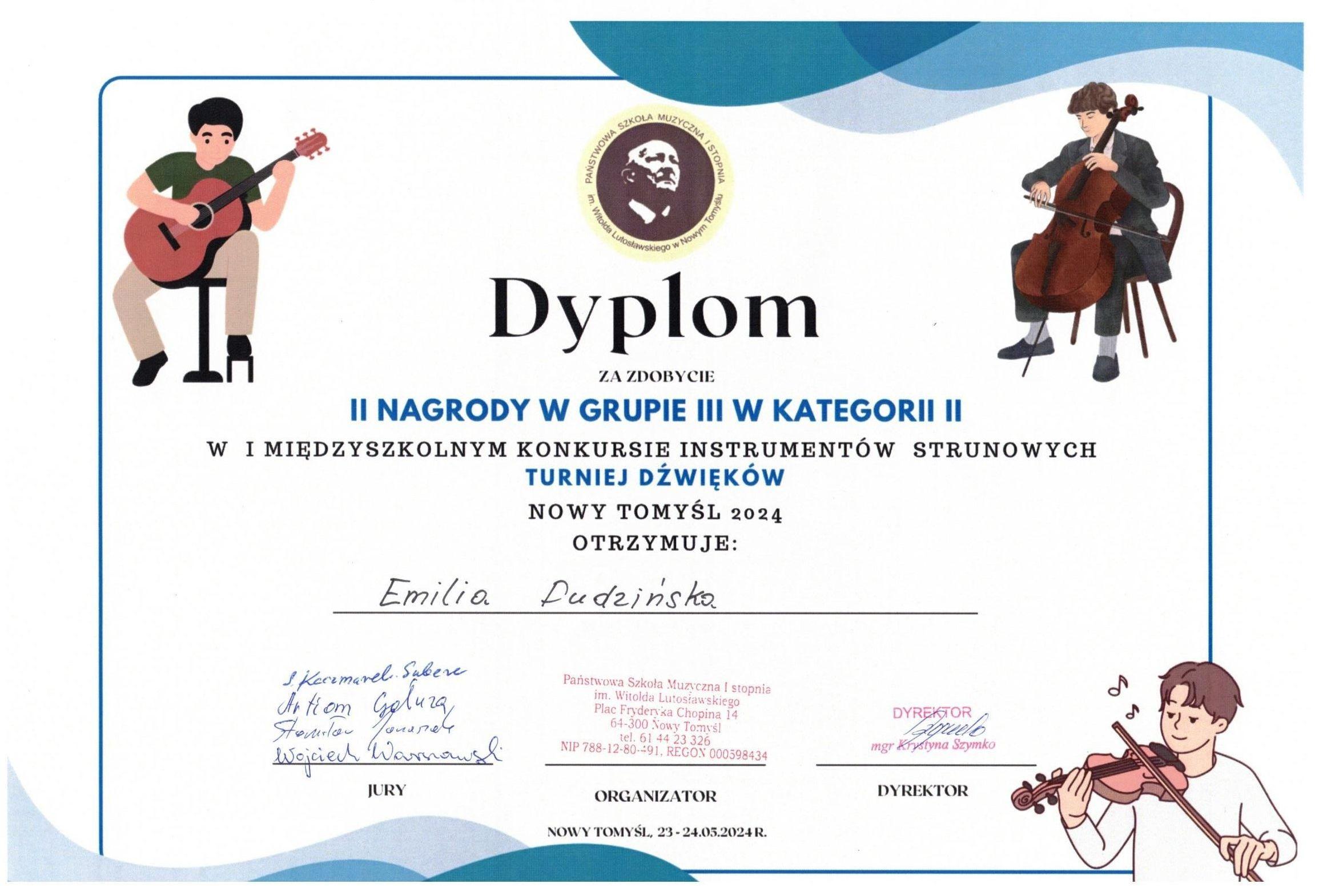 W kategorii II konkursu wystąpiła nasza gitarzystka Emilia Dudzińska, która uczy się w klasie pana Wojciecha Warszawskiego. Jury przyznało Emilii 2 miejsce w trzeciej kategorii wiekowej.