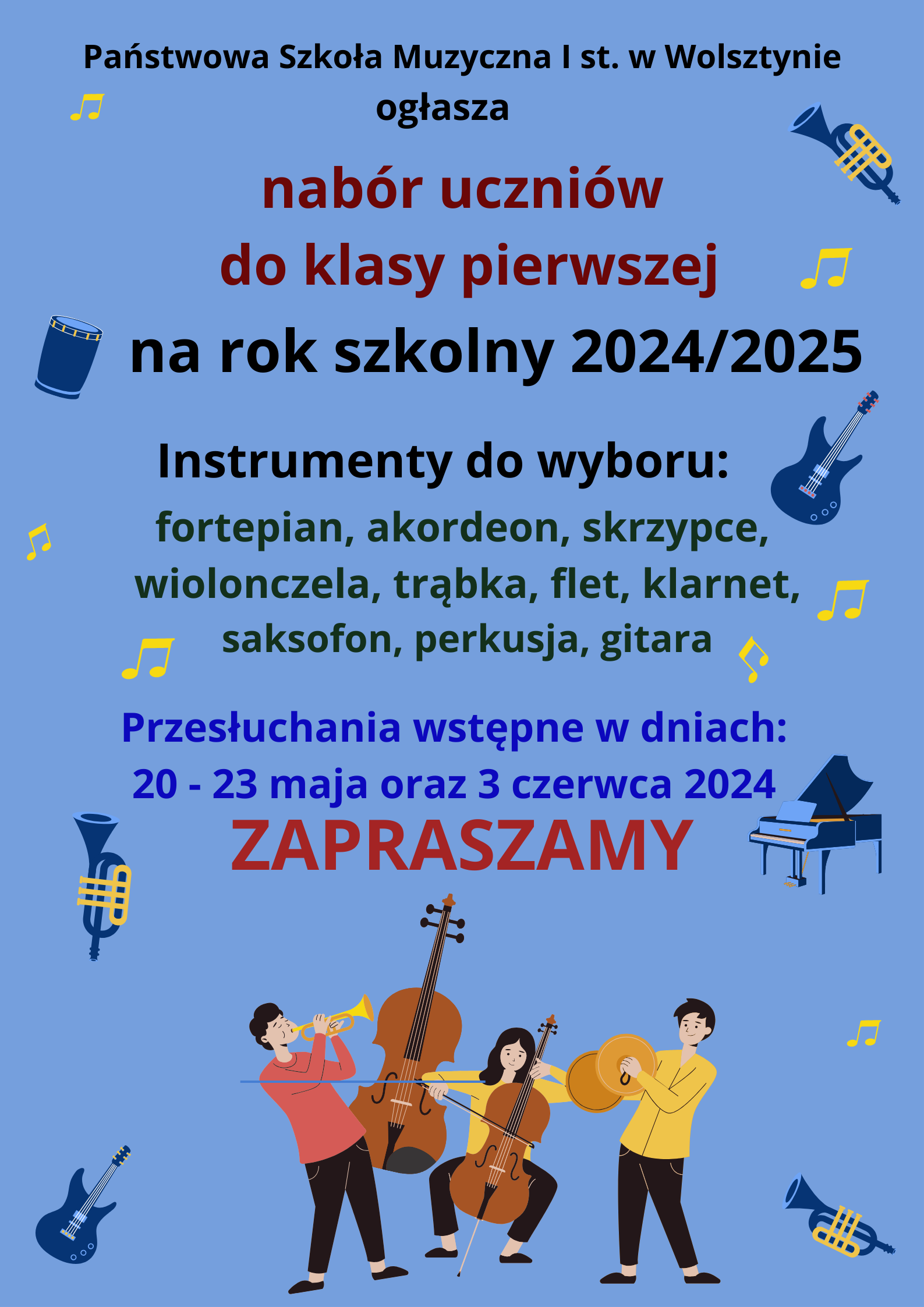 fortepianie, akordeonie, skrzypcach, wiolonczeli, gitarze, klarnecie, flecie, trąbce, saksofonie i perkusji dla dzieci od 7 (6) do 10 lat
