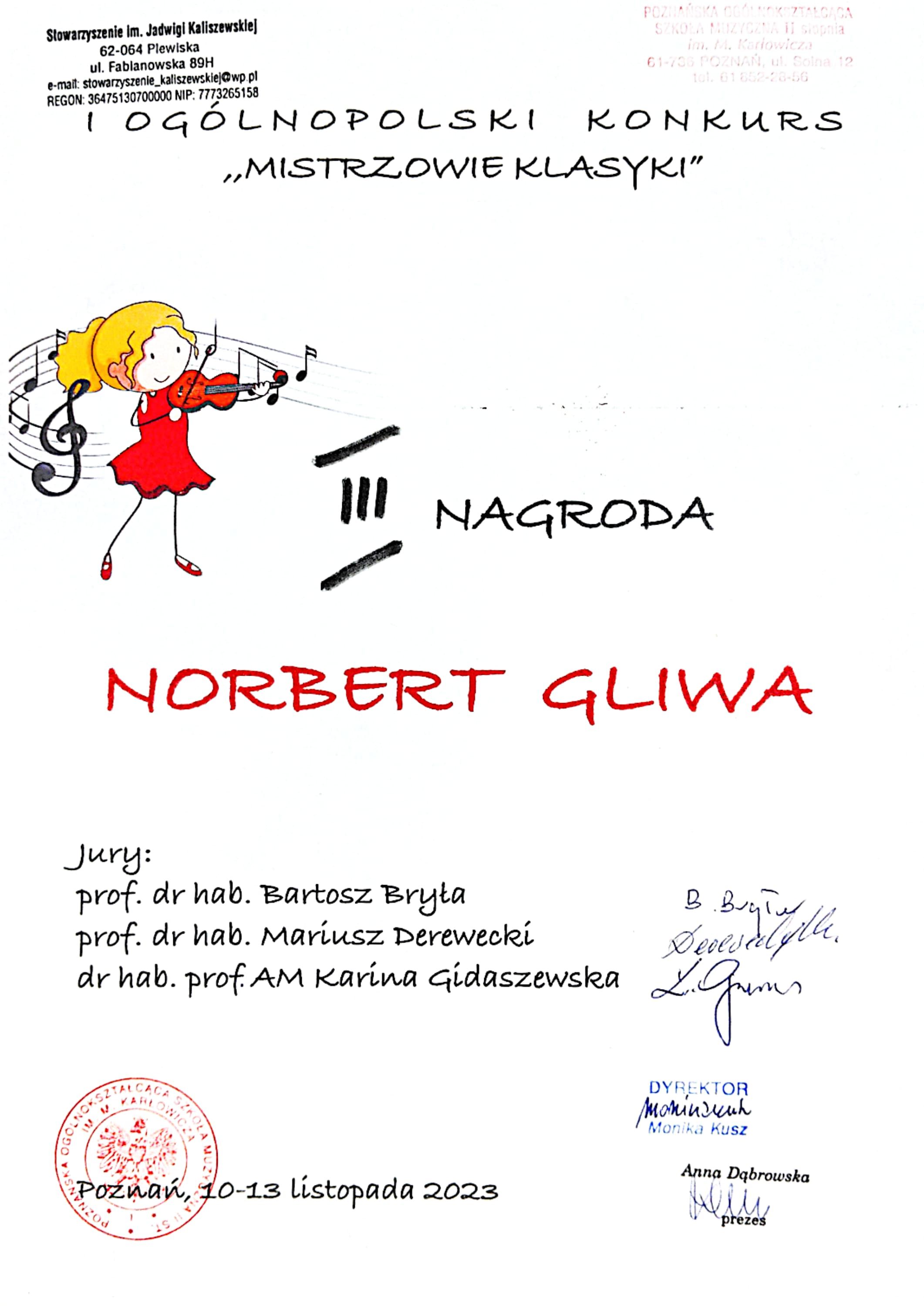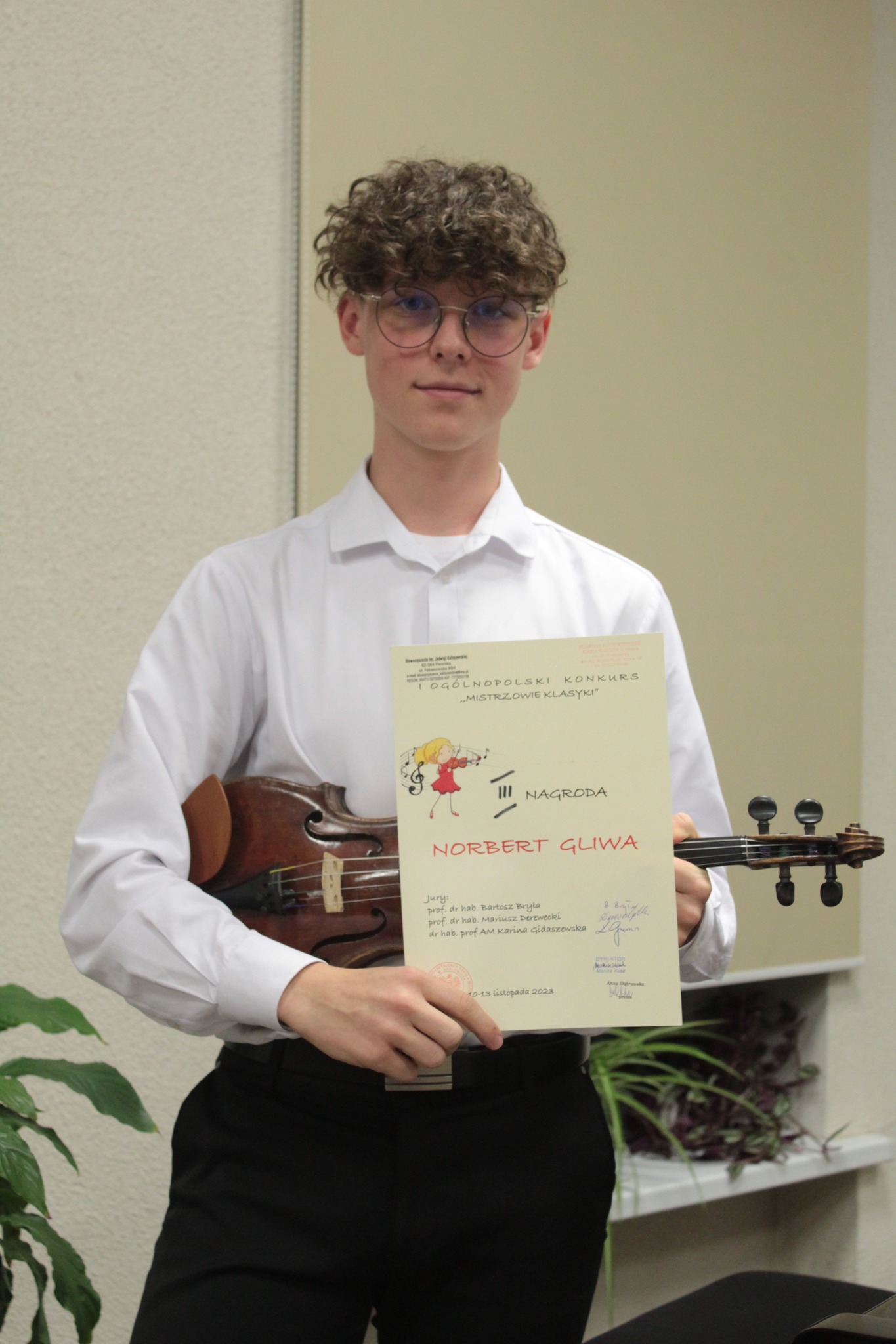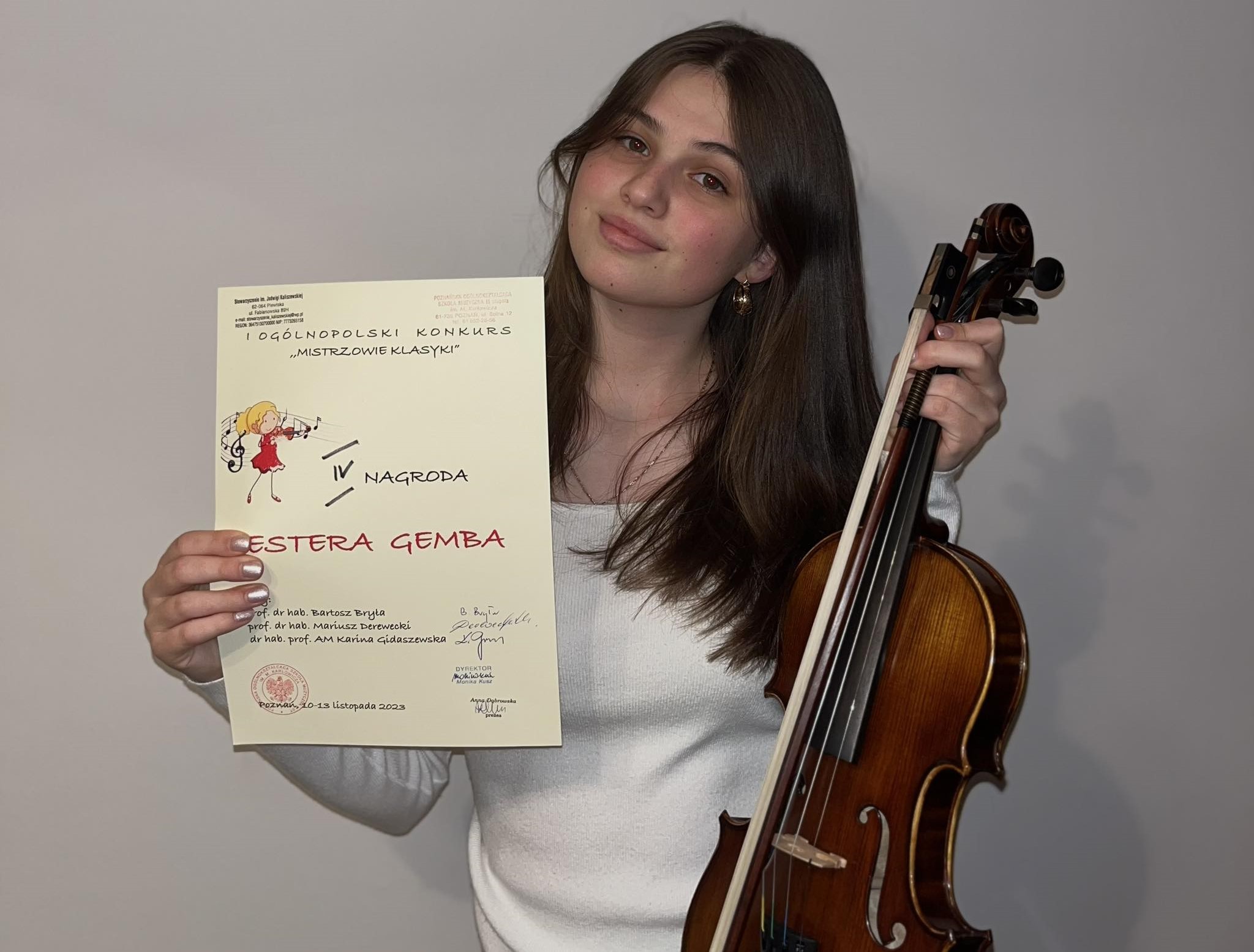 W dniu 12 listopada 2023 roku w Poznaniu odbył się I Ogólnopolski Konkurs Skrzypcowy "Mistrz klasyki". Wzięło w nim udział dwoje naszych uczniów z klasy skrzypiec pana Romana Mrozińskiego. Dla obojga udział w konkursie zakończył się sukcesem. W 2 grupie konkursowej jury przyznała Norbertowi Gliwie 3 miejsce natomiast Estera Gemba uplasowała się na miejscu 4. Obojgu akompaniował pan Karol Drynkowski. Jesteśmy z nich bardzo dumni. Gratulacje !