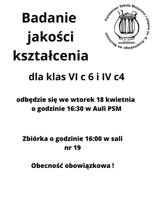 We wtorek 18 kwietnia 2023 o godz. 16.30 w auli PSM odbędzie się badanie jakości kształcenia.