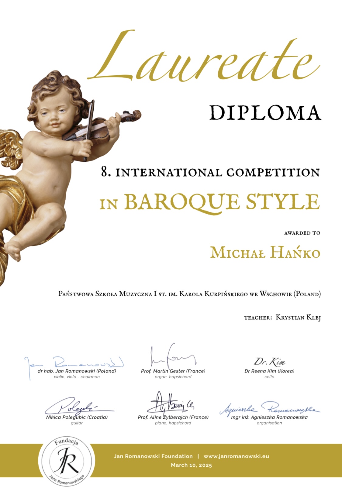 Michał Hańko, uczeń klasy organów p. Krystiana Kleja został laureatem konkursu w Barokowym Stylu. Konkurs jest organizowanym przez Fundację Jana Romanowskiego. Uczestników oceniało międzynarodowe jury, a w specjalności organy występ Michała oceniał prof. Martin Gester z Francji.