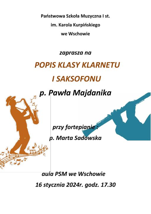 Zapraszamy na popis w wykonaniu uczniów klasy klarnetu i saksofonu p. Pawła Majdanika.