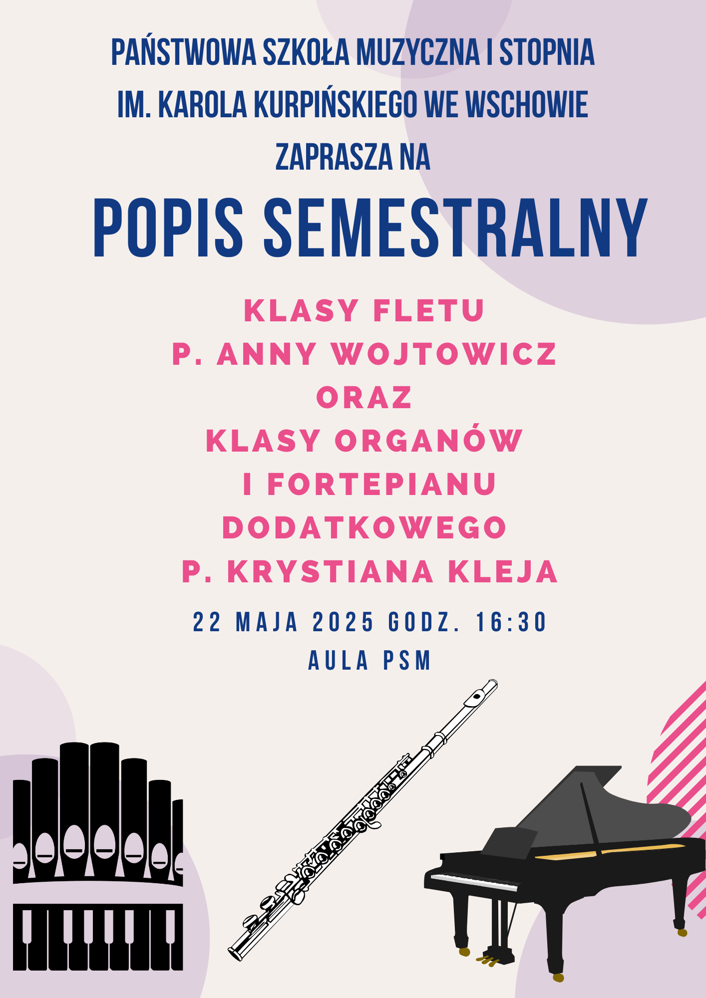 Państwowa Szkoła Muzyczna I st. im. Karola Kurpińskiego we Wschowie serdecznie zaprasza na popis semestralny uczniów klasy fletu p. Anny Wojtowicz oraz klasy organów i fortepianu dodatkowego p. Krystiana Kleja.