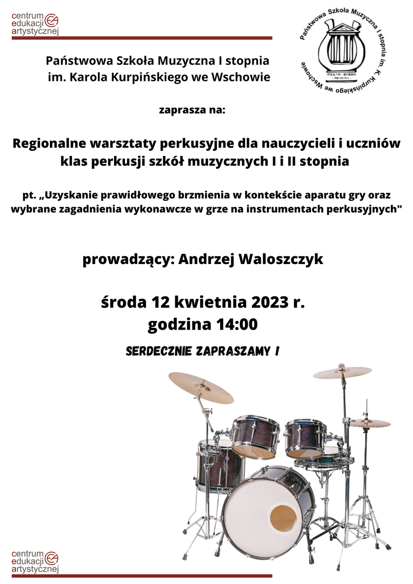 12 kwietnia w środę od razu po przerwie świątecznej w naszej szkole odbędą się regionalne warsztaty perkusyjne pod patronatem Centrum Edukacji Artystycznej skierowane do nauczycieli i uczniów klas perkusji szkół muzycznych I i II stopnia z regionów: lubuskiego i wielkopolskiego. Temat warsztatów to: "Uzyskanie prawidłowego brzmienia w kontekście aparatu gry oraz wybrane zagadnienia wykonawcze w grze na instrumentach perkusyjnych"
