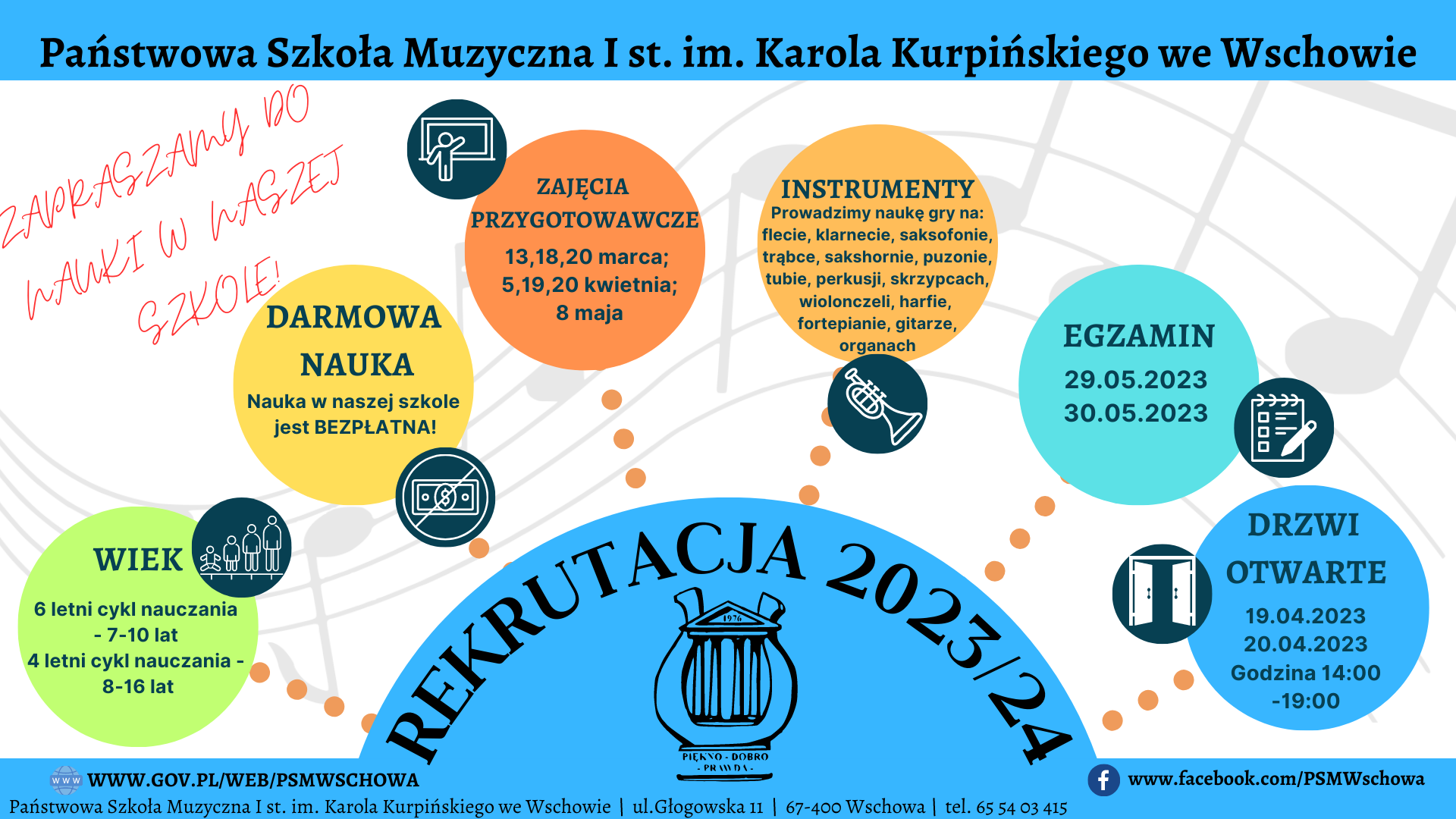 Badanie przydatności kandydatów ubiegających się o przyjęcie do Szkoły na rok szkolny 2023/24 odbędzie się w dniach 29 i 30 maja 2023 r. w budynku PSM I st. we Wschowie, ul. Głogowska 11, 67-400 Wschowa