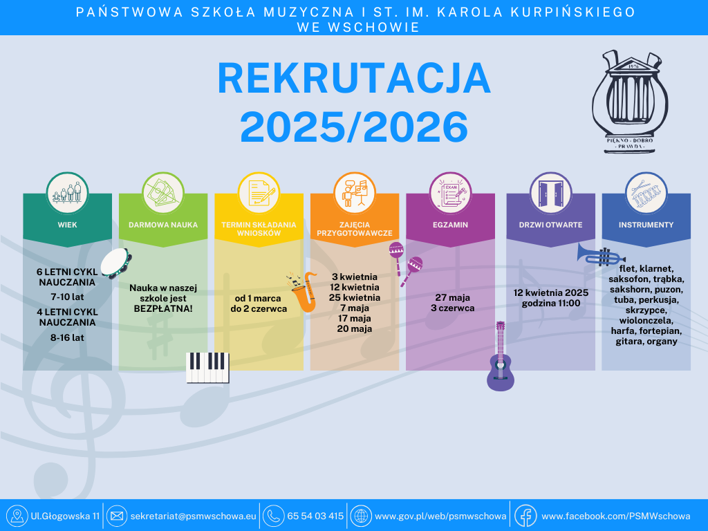 Badanie przydatności kandydatów ubiegających się o przyjęcie do Szkoły na rok szkolny 2025/2026 odbędzie się w dniach 27 maja i 3 czerwca 2025 r. w budynku PSM I st. we Wschowie, ul. Głogowska 11, 67-400 Wschowa.