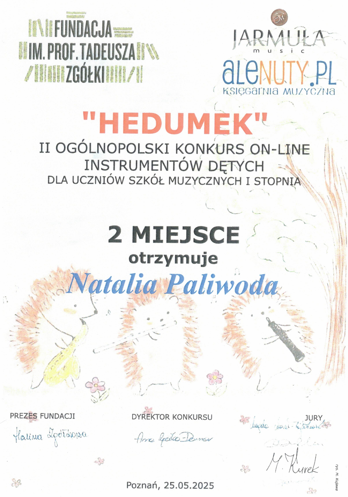 Natalia wzięła udział w II Ogólnopolskim Konkursie on-line "HEDUMEK" - dla uczniów szkół muzycznych I stopnia, grających na instrumentach dętych i została laureatką II MIEJSCA.