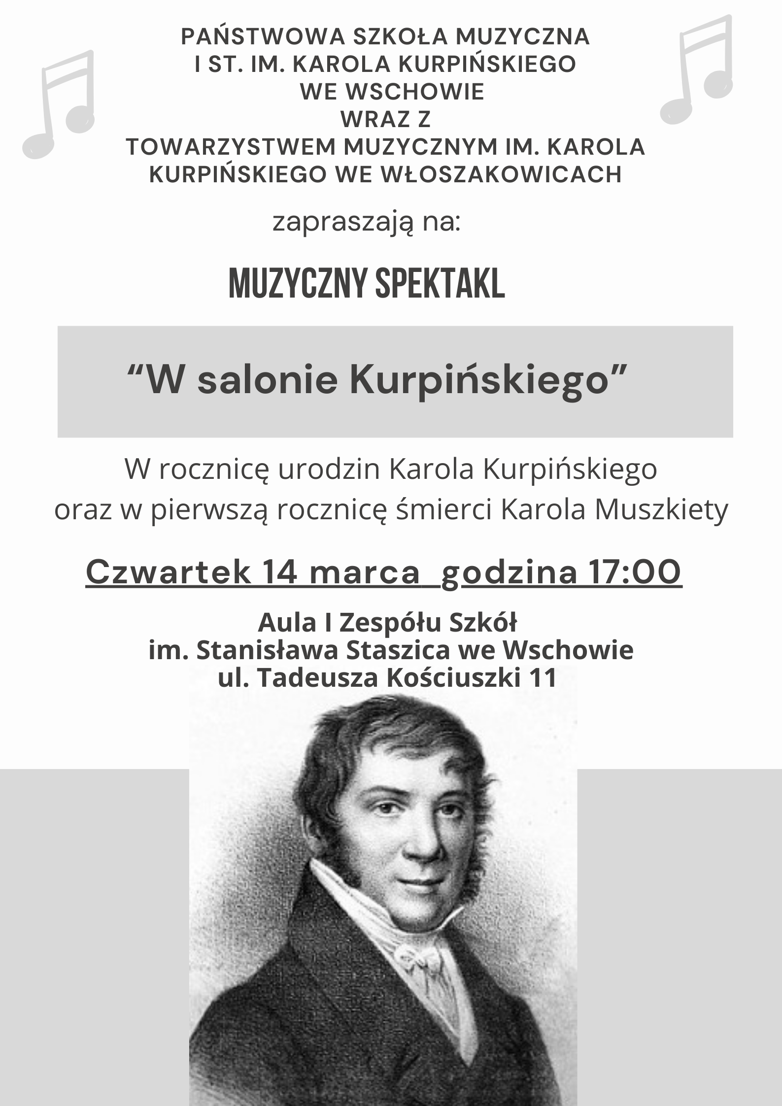 Państwowa Szkoła Muzyczna I stopnia im. KArola Kurpińskiego we Wschowie wraz z Towarzystwem Muzycznym im. Karola Kurpińskiego we Włoszakowicach zapraszają na Muzyczny Spektakl "W salonie Kurpińskiego".