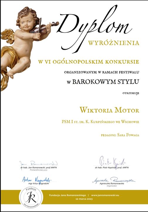 Nasza uczennica Wiktoria Motor z klasy skrzypiec Pani Sary Powaga zdobyła wyróżnienie w VI Ogólnopolskim Konkursie organizowanym w ramach Festiwalu w Barokowym Styl.
