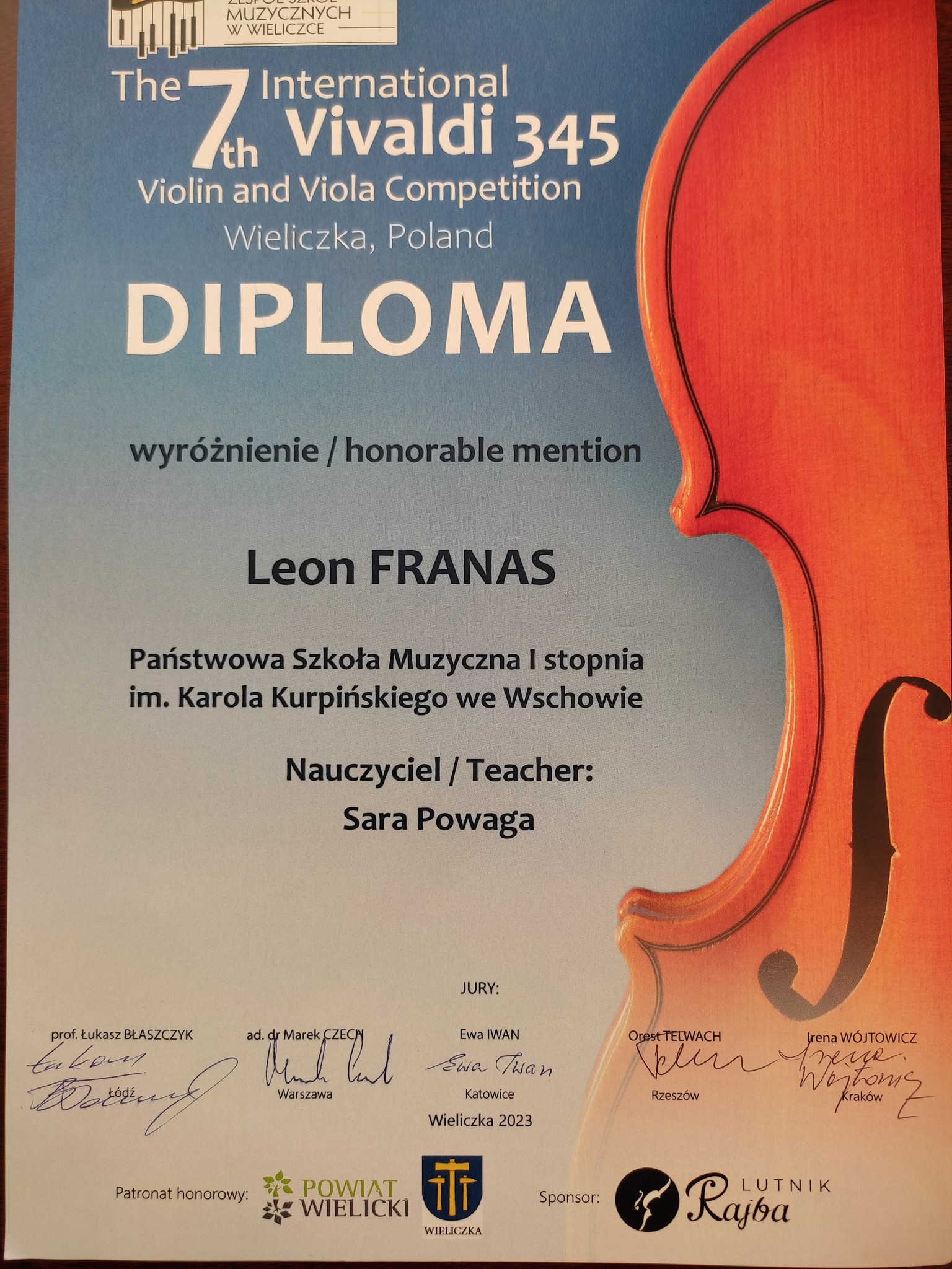 Uczeń z klasy I - Leon Franas otrzymał wyróżnienie na VII Międzynarodowym Konkursie Skrzypcowym i Altówkowym "Vivaldi 345" organizowanym przez Zespół Szkół Muzycznych w Wieliczce.