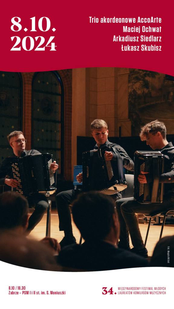 We wtorek, 8 października br. o godzinie 18.30 w sali koncertowej naszej szkoły odbędzie się wyjątkowy koncert w ramach 34. Międzynarodowego Festiwalu Młodych Laureatów Konkursów Muzycznych, którego organizatorem jest Instytucja Kultury im. Krystyny Bochenek Katowice-Miasto Ogrodów. Wystąpi trio akordeonowe AccoArte wskładzie: Maciej Ochwat, Arkadiusz Siedlarz i Łukasz Skubisz.